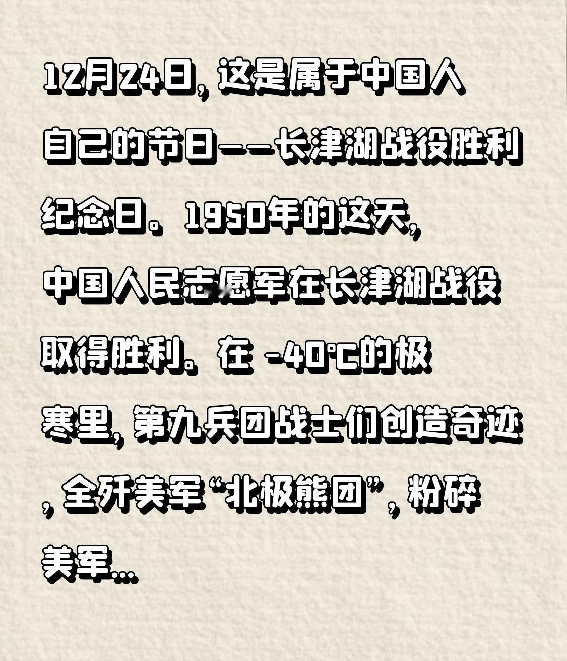12月24日,这是属于中国人自己的节日——长津湖战役胜利纪念日。1950年的这天,中国人民志愿军在长津湖战役取得胜利。在 -40℃的极寒里,第九兵团战士们创造奇迹,全歼美军“北极熊团”,粉碎美军计划。“冰雕连”战士至死坚守,无数志愿军献出生命。