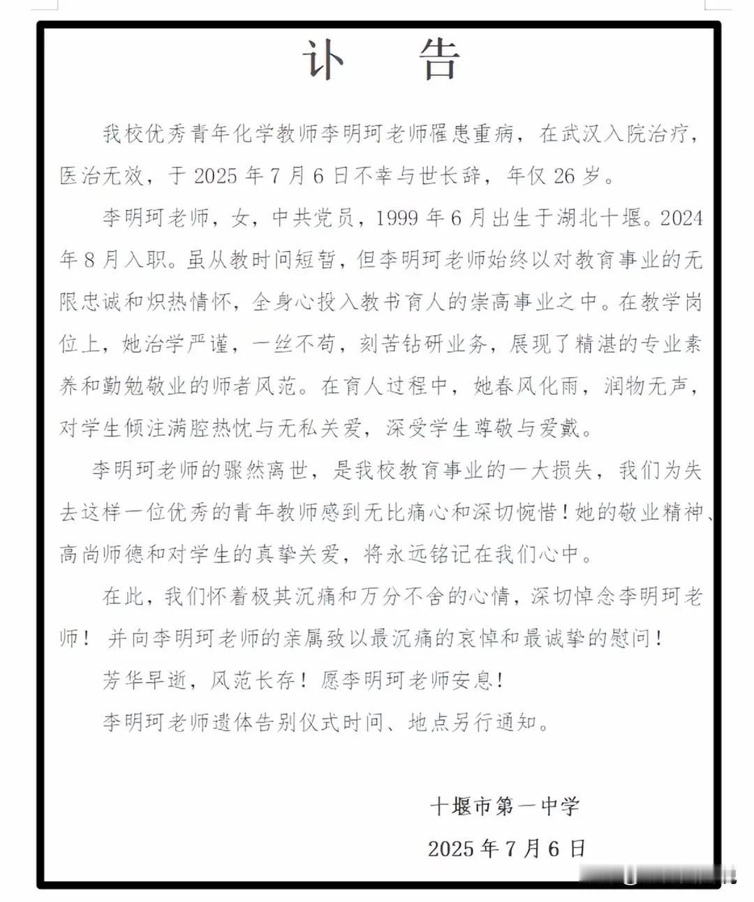 2025教学 生涯最短的离世教师:26岁、11个月、328天、高层次。 然而,李明珂的故事远比这些令人心碎的细节更深层次。它像一面镜子,映照出当下教育和社会的某些“隐形病痛”。我们常常在赞叹“天赋”和“努力”的光环时,忽略了背后那一份未被察觉的沉重——那是一种现代社会普遍存在的“快节奏焦虑”和“隐藏的压力”。 在这个信息爆炸、竞争激烈的时代,年轻人的青春,似乎都被按上了“加速键”。他们的梦想被瞬间点燃,却也在无形中被“烧得焦黑”。李明珂用她短暂的一生,告诉我们:再“优秀”的人,也有承受极限的时候。再“拼命”的人,也需要喘息和关怀。 很多时候,我们把责任归咎于“个人努力”,但忽略了制度的缺陷和社会的重压。高校、企业、甚至家庭,都在无形中推高了对年轻人的期待值,却少有人问:他们的身心健康,是否也值得被呵护?我们是否忽视了,为什么那么多像李明珂一样的天才,最后都变成了“牺牲品”? 更令人心疼的是,这背后隐藏的“人性洞察”。每一个“拼命三娘”的背后,是对“完美”的渴望,是对“成功”的焦虑。每一位“温柔姐姐”的微笑,都是对压力的忍耐与坚持。我们看到的,是他们的努力和奉献,但也应看到他们“压力的折射”和“脆弱的边界”。 或许,李明珂的离去,是一种无声的呐喊:我们需要改变的,不只是制度,更是对年轻一代的理解和关怀。我们需要让“拼搏”不再成为“牺牲”的代名词,让“成长”不再以“透支”为代价。 这不仅是教育界的悲哀,更是整个社会的警钟。我们每个人都应问问自己:在追逐梦想的同时,是否也在关心那些在“背后拼命”的人?在表扬他们“拼搏精神”的同时,是否也在为他们的健康和幸福努力? 李明珂用她短暂的生命,唤醒了我们对“年轻、热血、但也脆弱”的深刻认知。她的故事,应该成为我们反思和行动的起点——让未来的年轻人,既能“追梦”,也能“活得健康、活得有尊严”。 这一切的答案,或许都藏在我们每个人的心里。只要我们愿意去听、去理解、去改变,就能为这个社会多一份温暖、多一份希望。