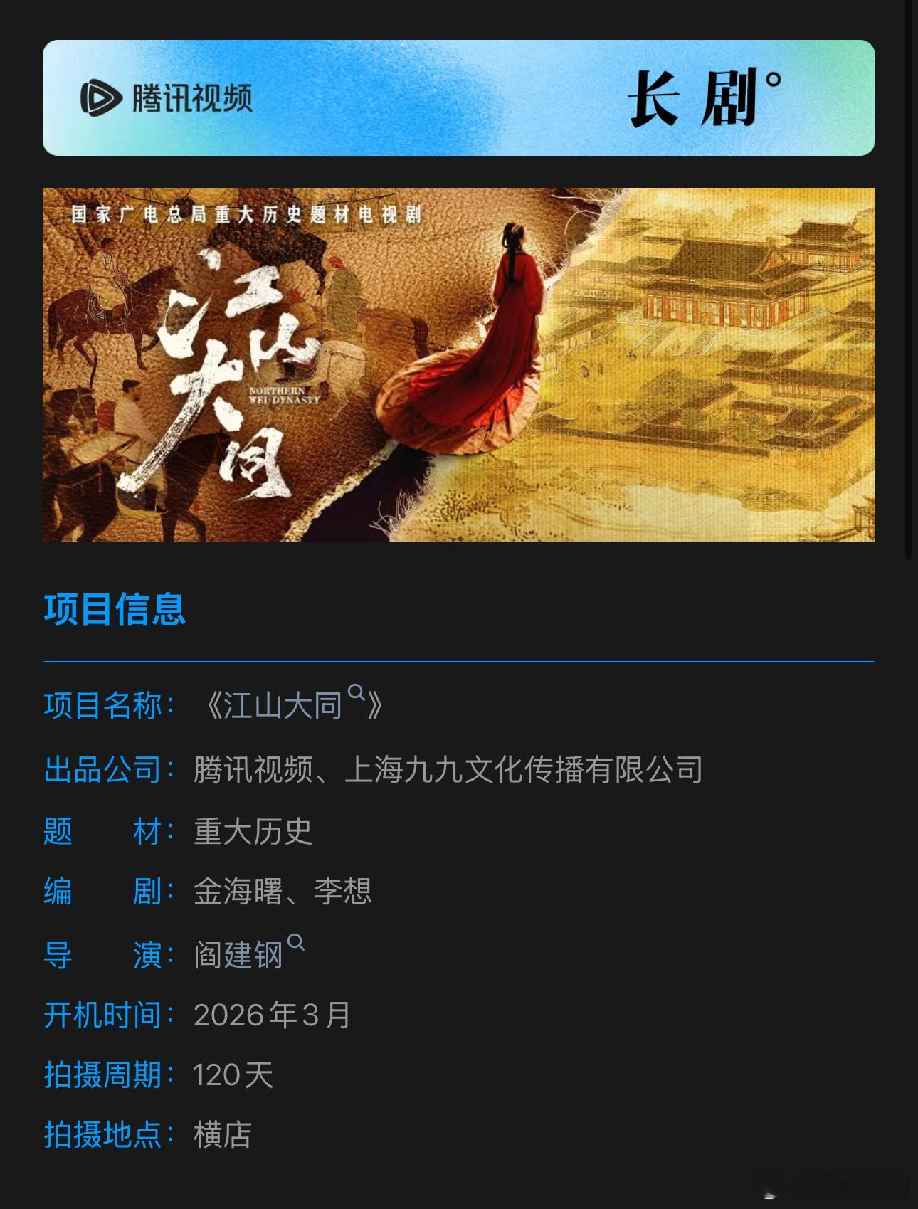 杨幂主演的广电重大历史题材电视剧《江山大同》组讯来了,腾讯视频天璇工作室群出品。妥妥的大女主 历史大剧!天璇工作室代表作:《三体》《繁花》《庆余年2》《玫瑰的故事》,腾讯视频的复婚诚意,坐等大家验收