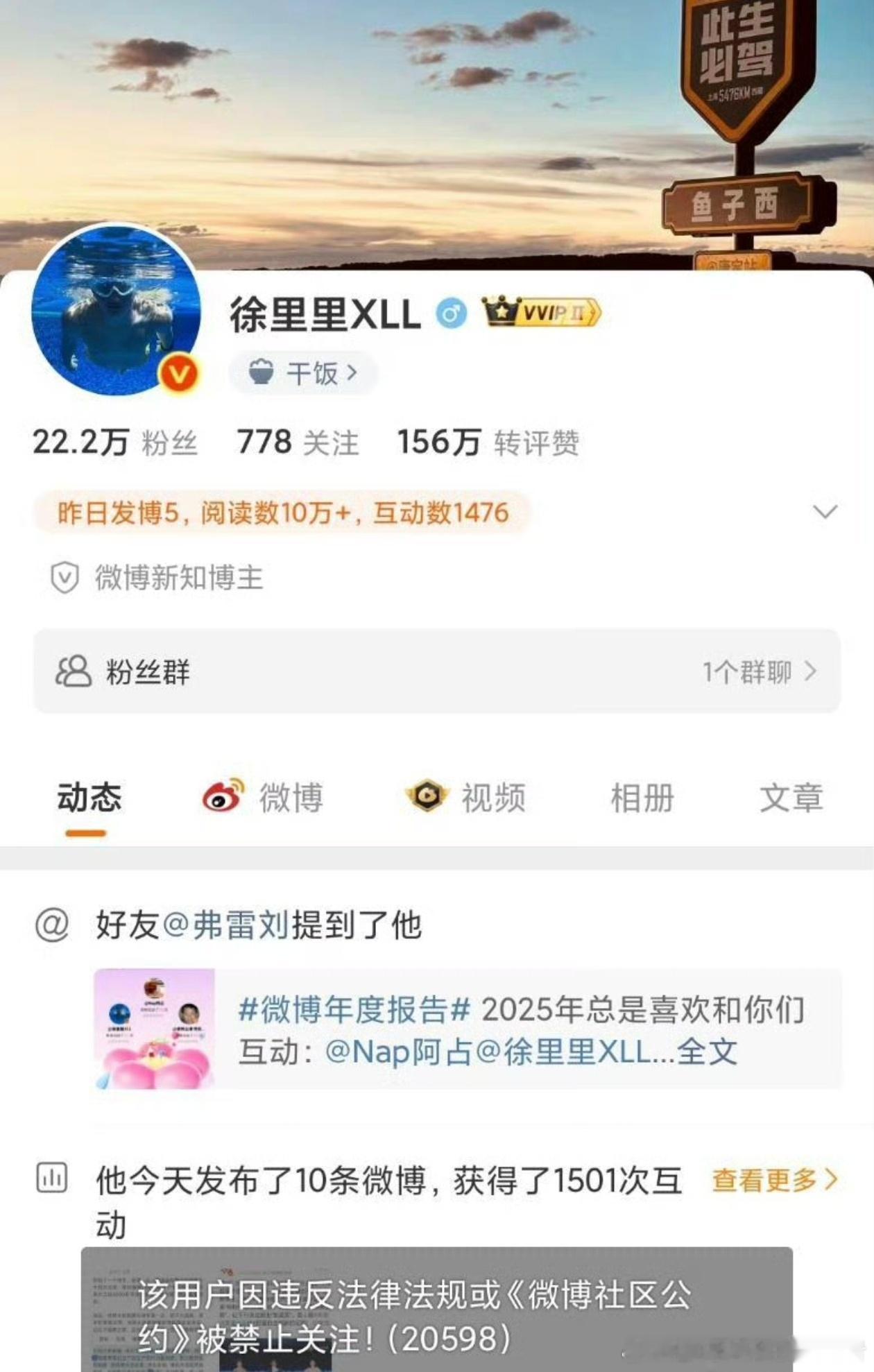 刚刚刷微博看到,知名大V“徐里里”又被禁言了,现在已经禁止关注。只想说,微博这次干得漂亮,像这种靠着阴阳怪气起号的迟早会遭到反噬,被禁言纯属活该。