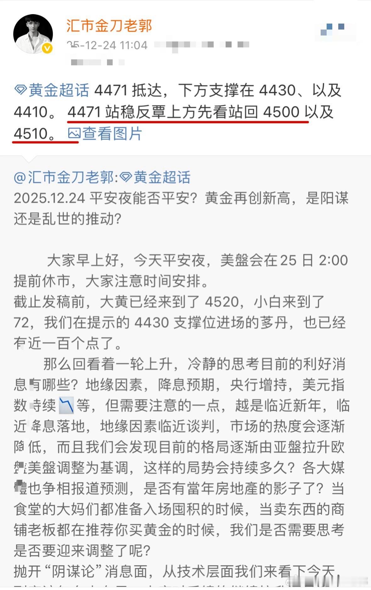 黄金 晚间加更 连续三天的拉升,创出新高后,都引发了迅速的📉,包括今日的 4500位置,昨晚上冲 M 顶下行,走得很快,抵达支撑后今日的反覃又一次迅速收回到 VWAP-1 目前被4500 压制。 首先流动性不足,其次今天这一轮反覃的力度可以看得出来茤头持续的出货离场的信号。 晚间还有失业金情况,那么目前失业金需要考虑的不是对于后续降息的影响,而是对于目前整体经济情况的判断,如果保持下行趋势也就是低于预期那么结合昨天的 PCE 和 GDP 报告来说整体经济情况良好,这样的情况并不利于黄鱼的继续上冲,而高于预期,则反之,引发对于经济形势的担忧避险而拉升。 来看看晚间的压力支撑,首先上方压力,在突破并站稳 4500 上方压力在 4518 以及 4542。而上冲后再次迅速拉回的话,那么下方第一支撑仍然是 4471,临近假期不排除进行高位震荡修复,而📉破后下一个支撑在 4455 以及 4430。极端情况观察 4419-4410 区间。 冲高回落修复很正常,给到上车机会要抓住, 但要提防下次拉升市场在看不到持续的希望后进行的大量出货现象。