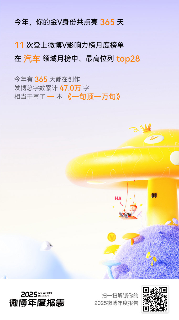微博年度报告这一年我的金V成就保持了365天~这份年终成绩单,必须秀一下!这离不开你们每次真诚的点赞、评论与转发,感恩2025的陪伴,速来>>2025微博年度报告 查收你的专属微博报告吧!微博之夜