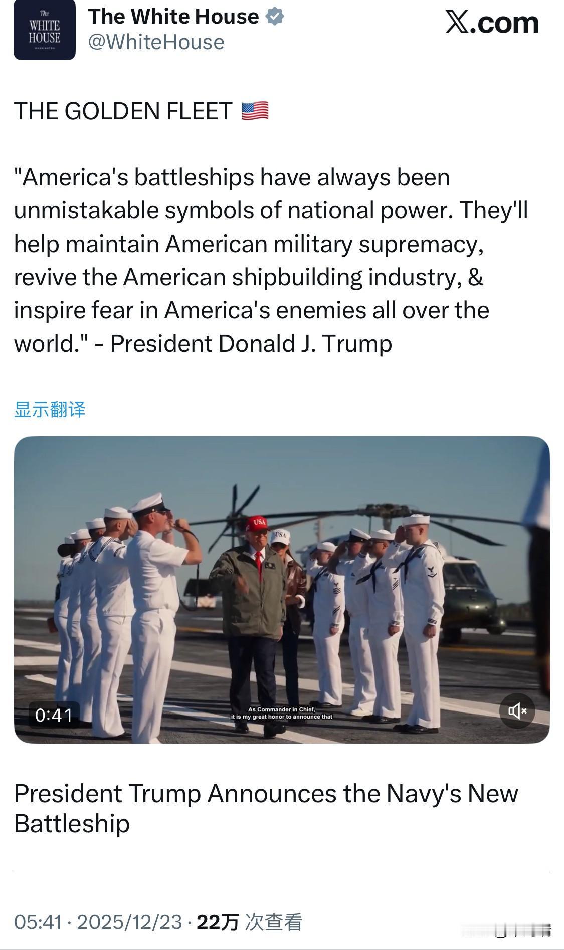 特朗普有关黄金舰队的最新表态: “美国的战舰一直是国家实力的鲜明象征。它们将有助于维护美国的军事霸权,重振美国造船业,并令世界各地的美国敌人胆寒。”