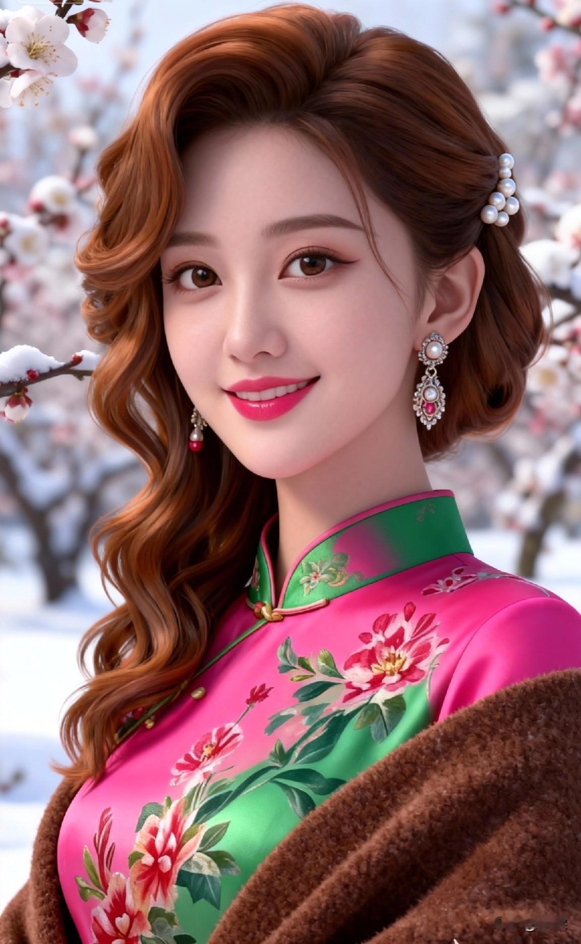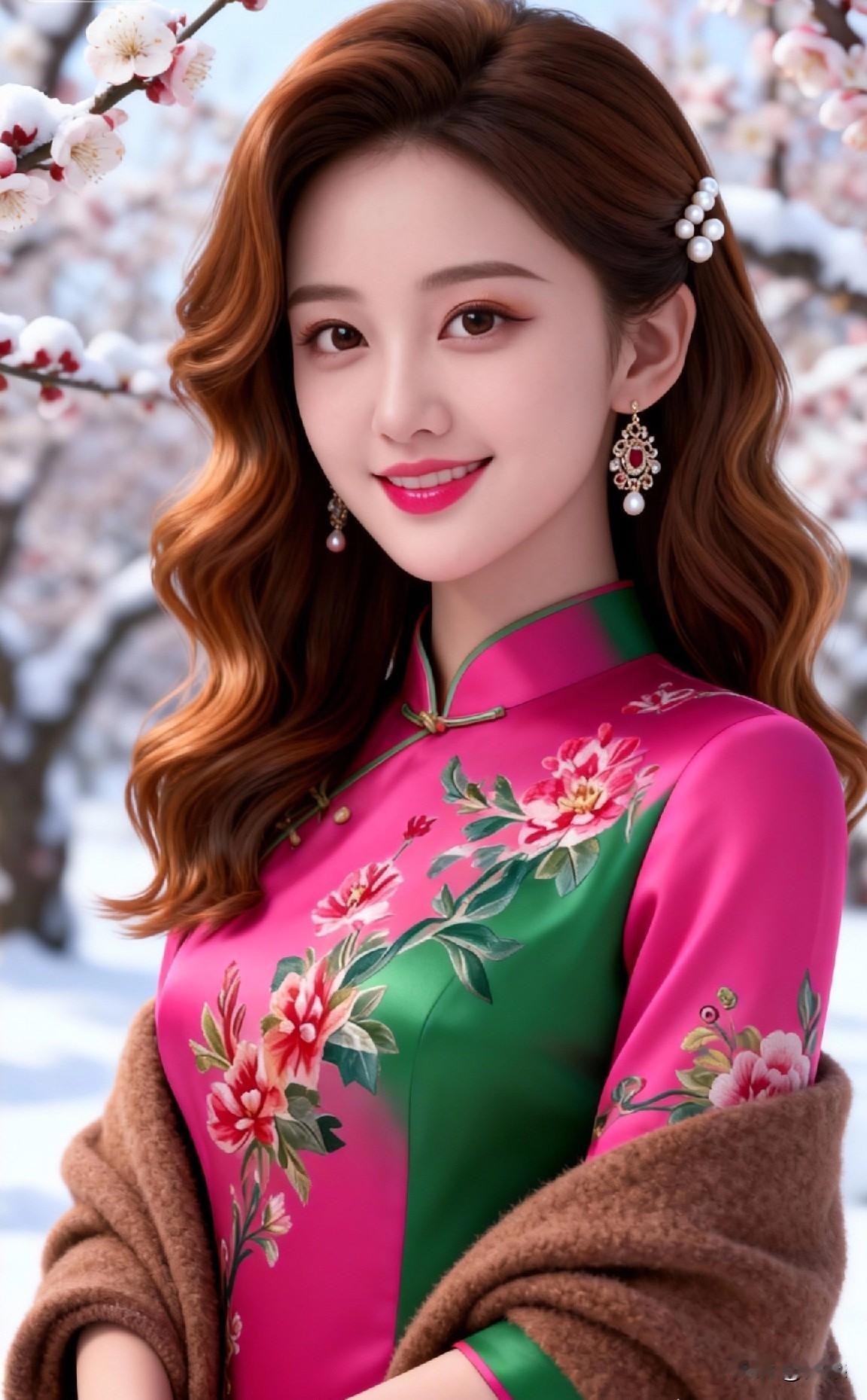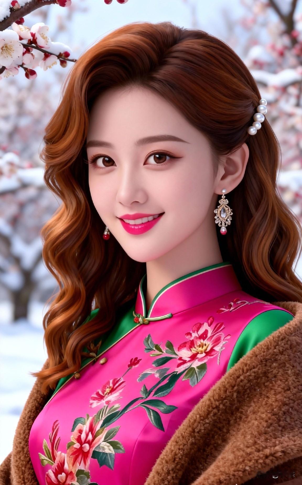 冬日雪景中的东方美人,粉嫩妆容与传统旗袍相映成趣旗袍秀东方美人旗袍古典美女新