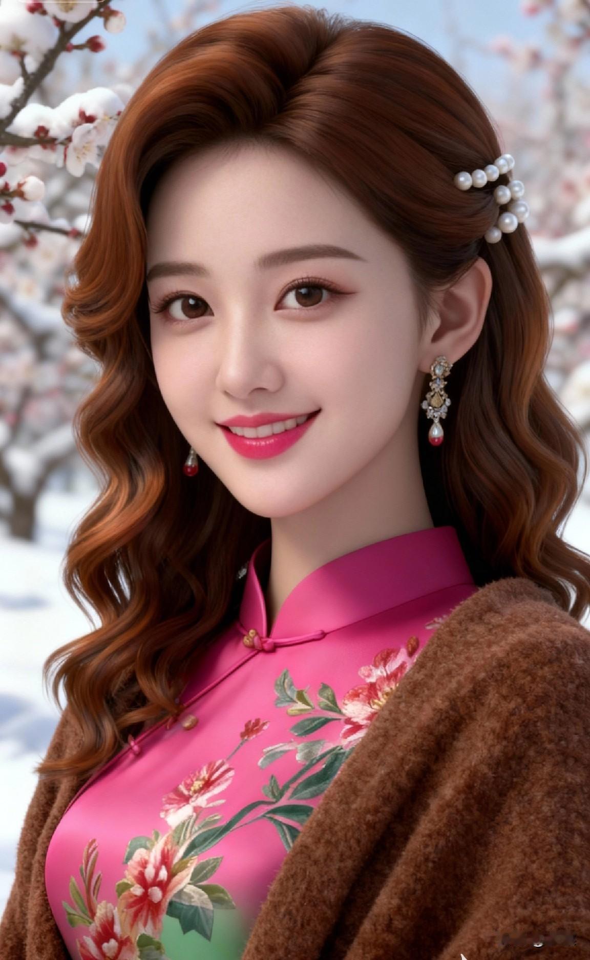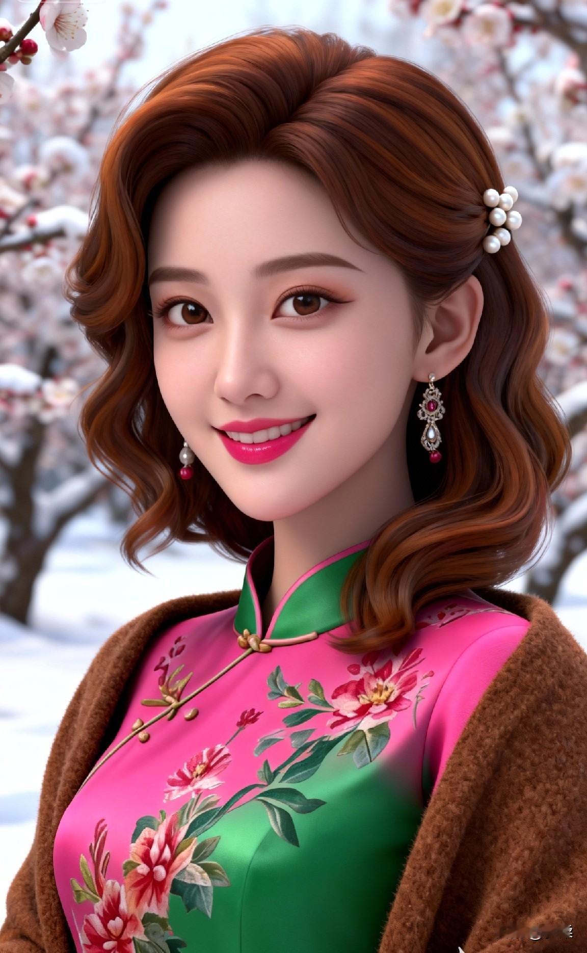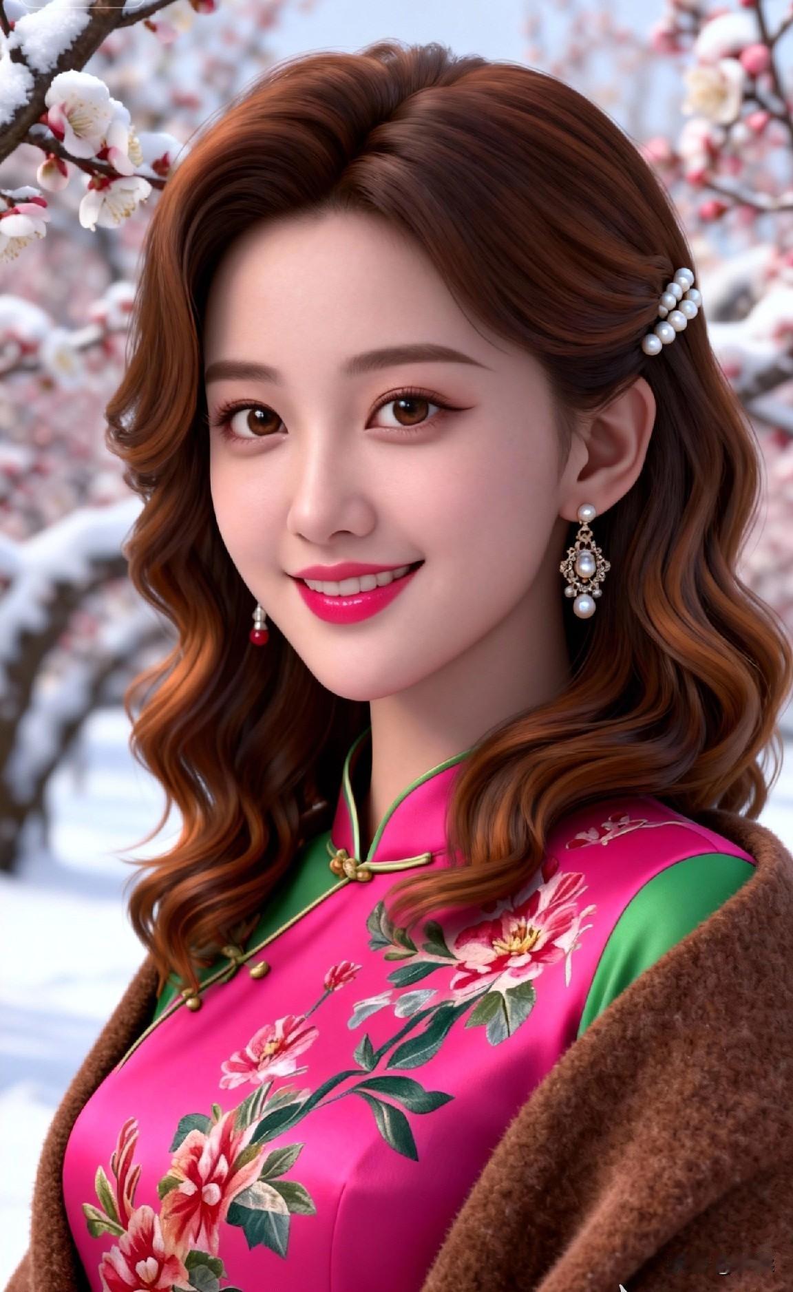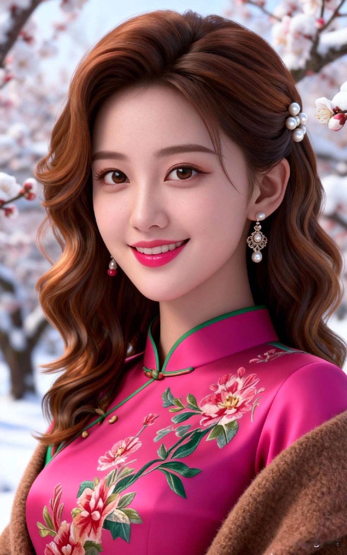 冬日雪景中的东方美人,粉嫩妆容与传统旗袍相映成趣旗袍秀东方美人旗袍古典美女新