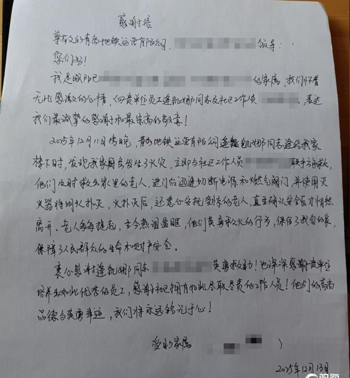 【“多亏了你!保住了我的家!”青岛小嫚逄凯娜,好样的[心]】“多亏了你!保住了我的家!”日前,青岛地铁自动化中心的通信检修工逄凯娜果断扑灭了一场火灾,成功解救了被困火海的老人,老人获救后激动地向她道谢。@中国文明网