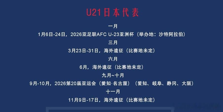 预计JFA将于12月31日左右公布参加2026年亚足联AFC U-23亚洲杯大名单。由于这是为2028年洛杉矶奥运会男足比赛而准备的球队,在2026年属于U21年龄组别。
