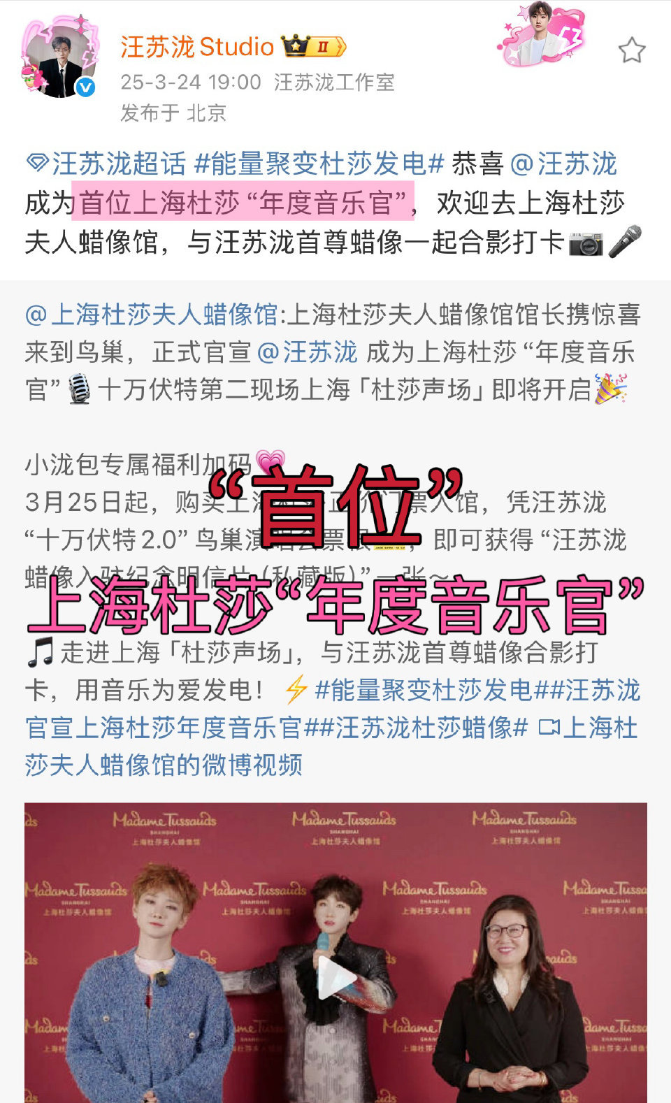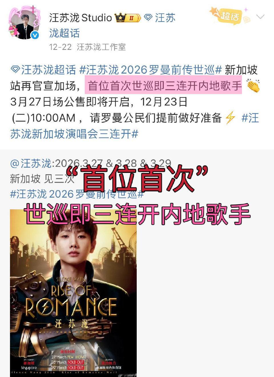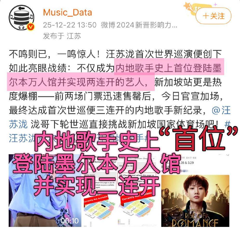 汪苏泷首字含金量还在上升汪苏泷“首”字的含金量,在2025年持续飙升!他是首位首次世巡就实现新加坡三连开的内地歌手,也是内地史上首位登陆墨尔本万人馆并两连开的艺人;打造全球首部XR演唱会互动电影、中文世界首部演唱会设定集,还拿下皮克斯电影首支原创定制中文片尾曲。从沈阳首位大麦想看破百万歌手,到鸟巢首个3+4面台创举,再成上海杜莎首位年度音乐官,每一个“首”字,都是他用实力书写的音乐新章,浪漫与突破永远在线。