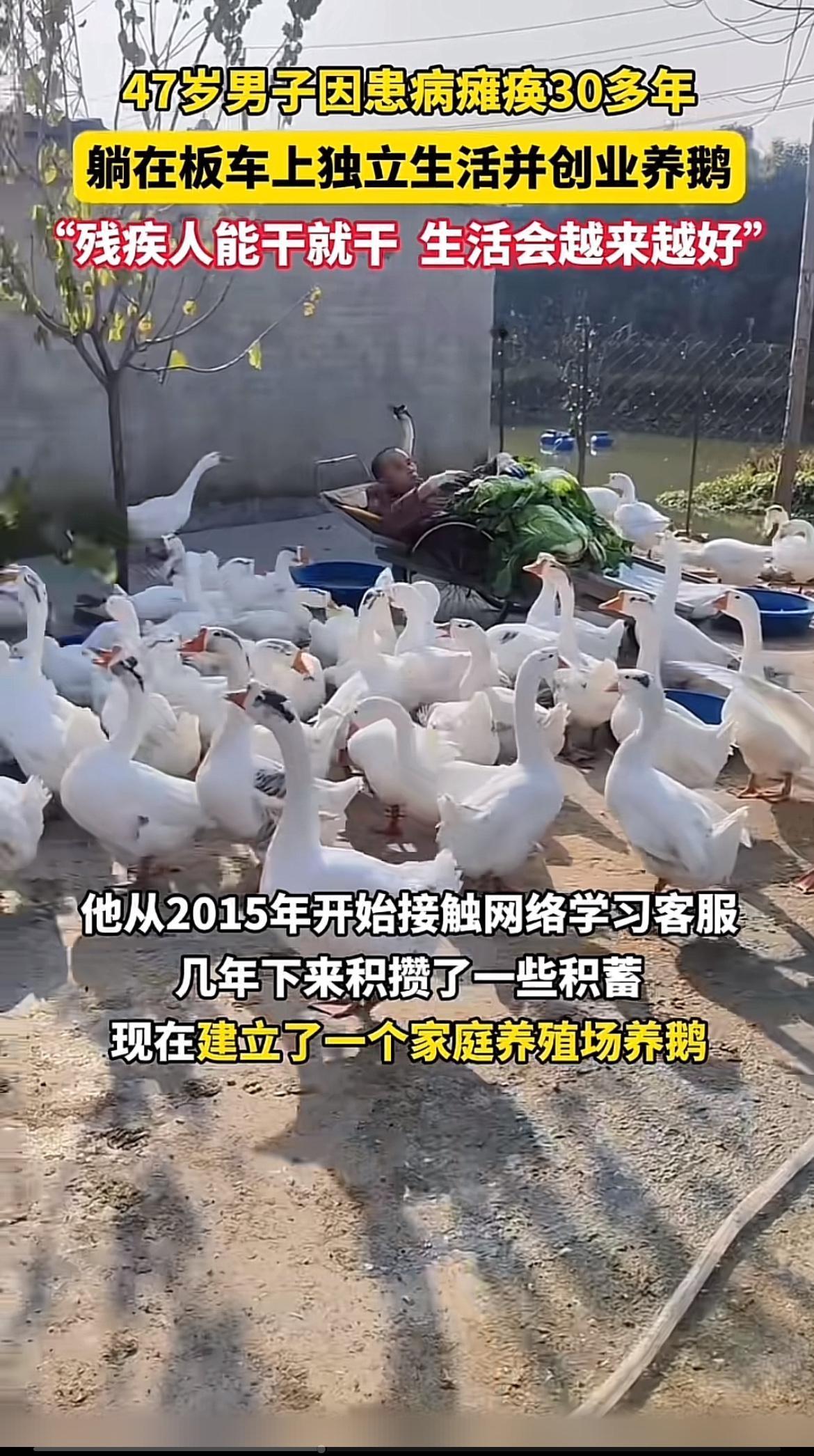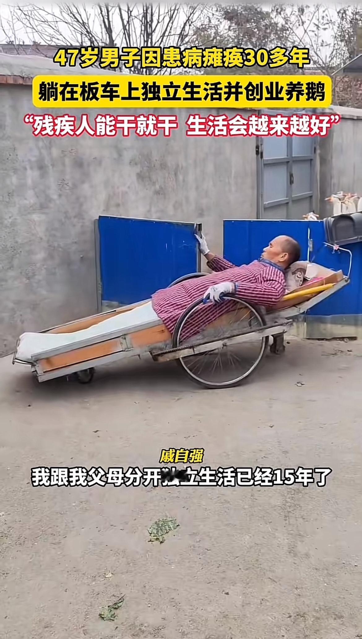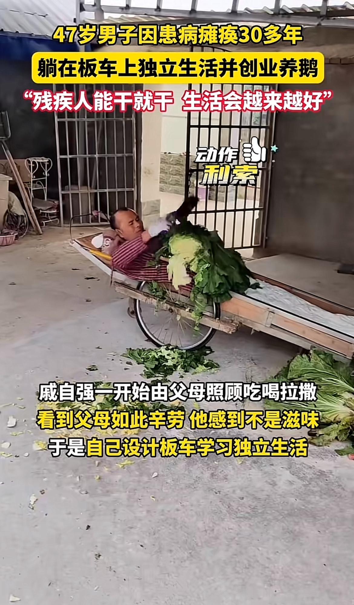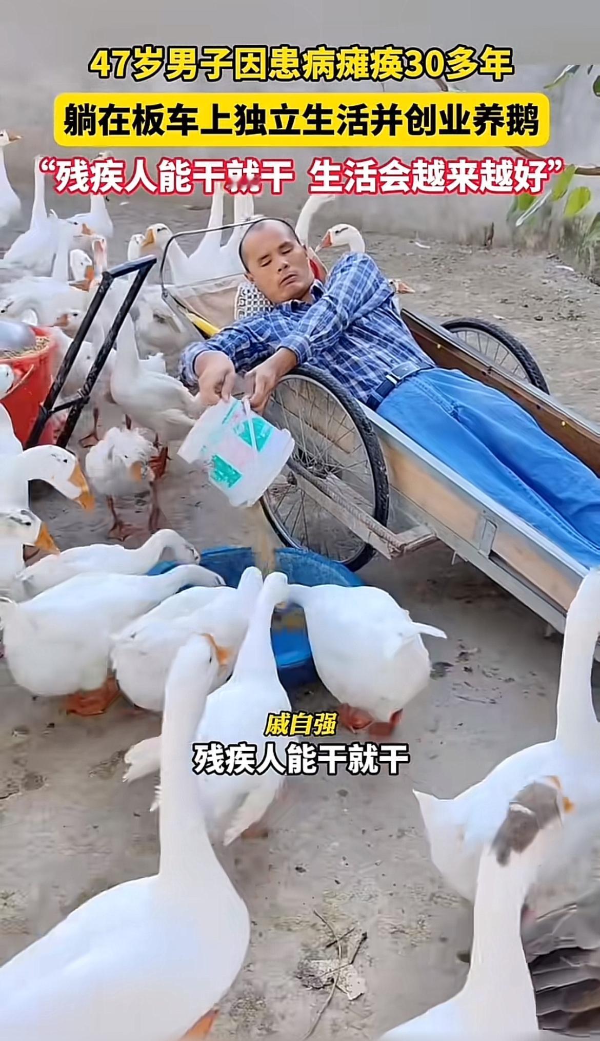 河南周口47岁的戚志强太励志了!他从小患类风湿,后发展成强直性脊柱炎,瘫痪在床30年。前15年靠父母照顾,还曾多次轻生。2015年弟弟患病,他决定逆袭。自制板车独立生活,开始做客服、养大鹅、开直播。 他躺在离地面不超半米的板车上,却把日子过得有滋有味,能熟练做饭、洗衣,用机器加工玉米喂鹅。他说养鹅是想让生活更好。如今他养鹅视频冲上热搜,获全国千万网友点赞。这真的告诉我们,只要有信念,再难的生活也能活出精彩。