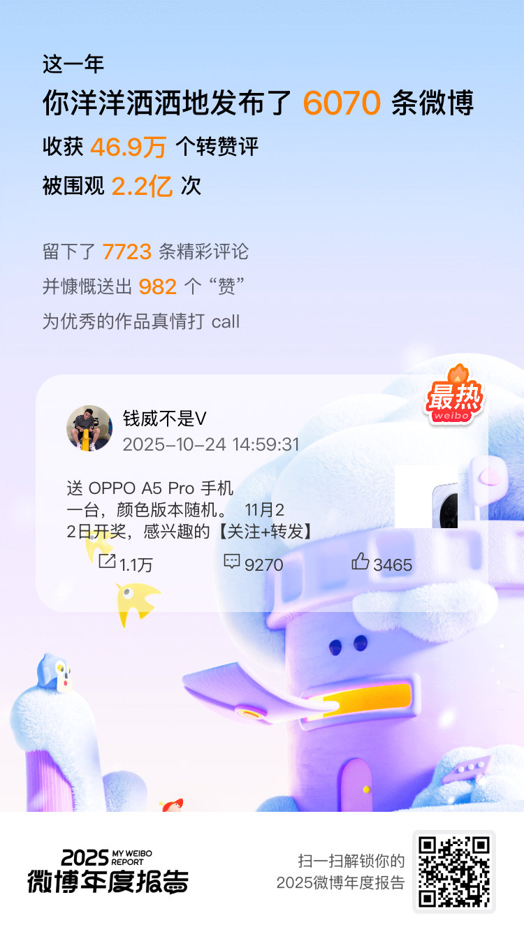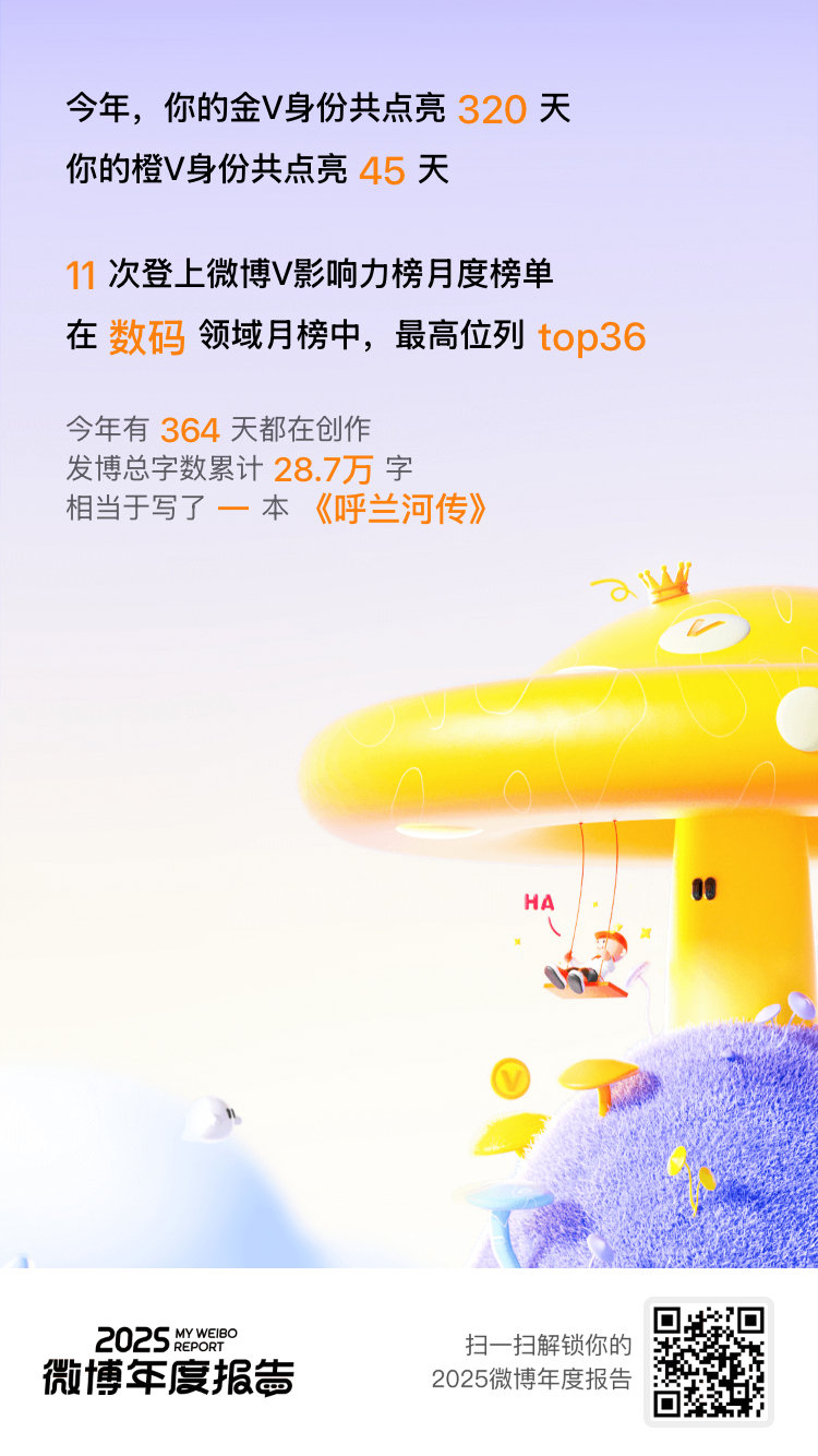 微博年度报告 实力这一块,咱确实拿捏了!2025年稳稳保持 金V身份320天,橙V身份45天!相逢的意义在于彼此照亮,这份成绩单离不开你们一直以来的支持和陪伴!你的专属年度播报也已生成,速来>>2025微博年度报告 围观!微博之夜
