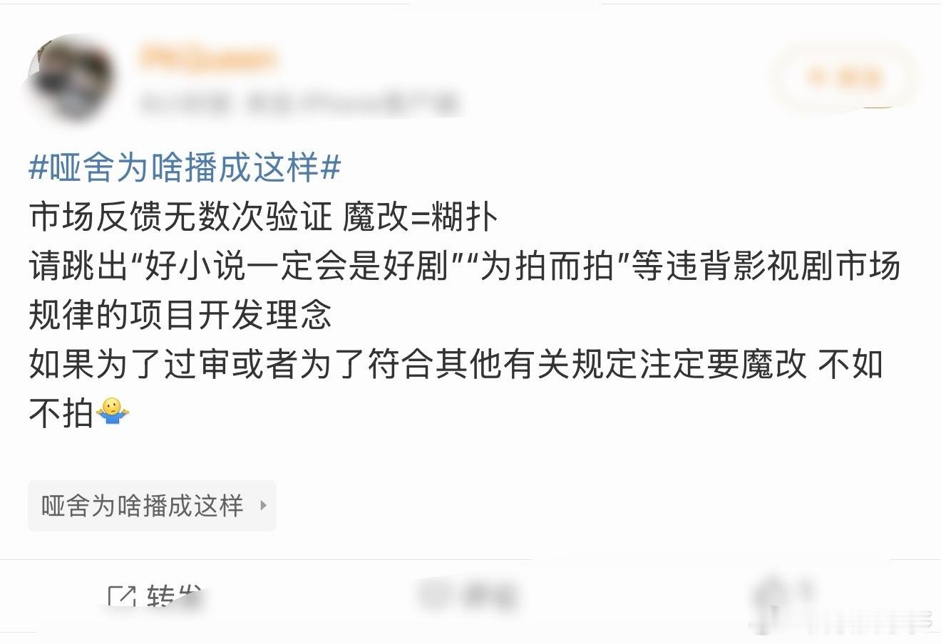 好小说一定能拍成好剧么近期《哑舍》开播后的争议。不少原著粉遗憾于剧情设定的大幅调整难以接受,仔细想想,文字的魅力在于留白与想象,影视化却需要具象化的镜头语言,改编本质是两种媒介的对话,既要面对“千万读者心中有千万个主角”的受众期待,也要平衡商业逻辑与艺术表达的张力。不捧不踩只聊现状:你觉得好小说影视化的关键是什么?是死守细节还原,还是在核心精神不变的前提下大胆创新?欢迎理性分享看法~哑舍为啥播成这样