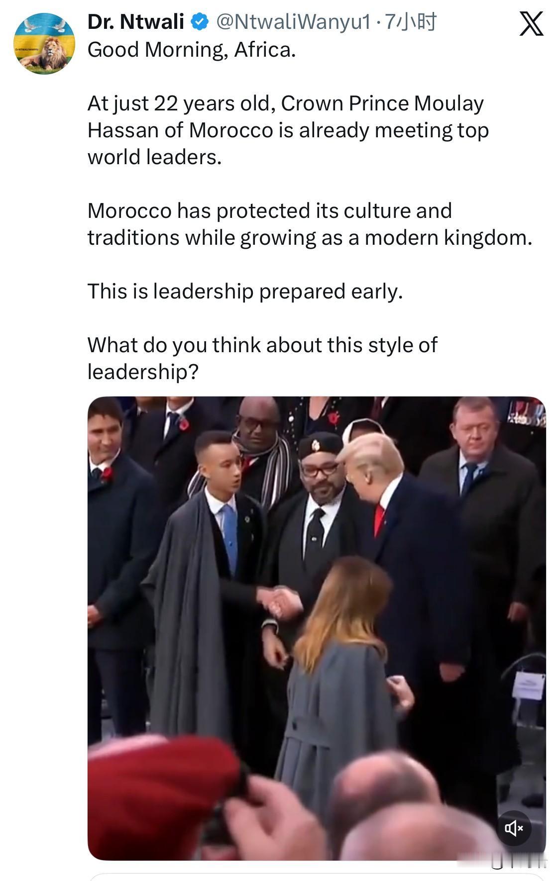 2025 年,22 岁的摩洛哥王储穆莱·哈桑(Moulay Hassan)在国际舞台上的角色愈发重要,频繁代表其父亲穆罕默德六世国王参与高规格外交活动。 由于穆罕默德六世国王长期健康状况欠佳,哈桑王储已成为摩洛哥在重大国际场合的“常驻面孔”。 2025 年,哈桑王储被晋升为摩洛哥皇家武装部队的上校指挥官(Colonel-Major)。他在学习国际关系专业的同时,已深度参与国家安全与地缘政治事务的决策过程。 分析认为,哈桑王储的高频露面是摩洛哥“代际接班”战略的一部分,旨在通过体育和外交渠道向非洲及全球展示摩洛哥政治权力的连续性和未来领导人的全球视野。