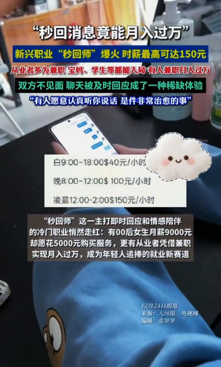 "秒回消息竟能月入过万",新兴职业"秒回师"爆火时薪最高可达150元。 大河报、央视网。 从业者多为兼职,宝妈、学生等都能入局。有人兼职月入过万,双方不见面聊天被及时回应成了一种稀缺体验。"有人愿意认真听你说话是件非常治愈的事"。 "秒回师"这一主打即时回应和情感陪伴的冷门职业悄然走红:有00后女生月薪9000元,却愿花5000元购买服务,更有从业者凭借兼职实现月入过万,成为年轻人追捧的就业新赛道。 在收费模式上,秒回师行业多以时段定价,按小时计费的价格从16元到150元梯度分布:基础时段(9:00-18:00)需求分散,报价较低;夜间(20:00-24:00)是情绪需求高峰,时薪涨至100元左右;凌晨(0:00-2:00)的"深夜陪伴档"因稀缺性,时薪可达150元。包月服务定价3000元至1万元不等。高端服务承诺"24小时待命,10秒内回应",还包含紧急疏导、节日陪伴等增值权益。 从业者多为兼职,身份多元:职场新人、宝妈、自由职业者、在校学生都能入局。