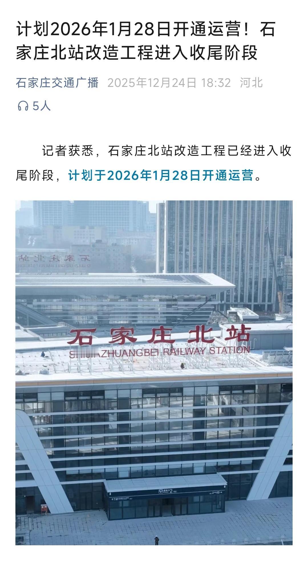 还是要祝贺石家庄,从几个小时前的最新消息看石家庄北站计划在2026年1月28日正式通车。 记得石家庄北站是在2024年10月28日停运改的,在2026年1月28日通车,因此此次石家庄北站的升级改造历时15个月。 建成后石家庄北站将接入石太高铁、石太铁路、石德铁路,站台规模依然是4台11线。今后大家在石家庄北站坐车会有更好的出行环境,崭新的南站房、北站房、站台雨棚更是看起来高大上,相信通车之后会让人眼前一亮。