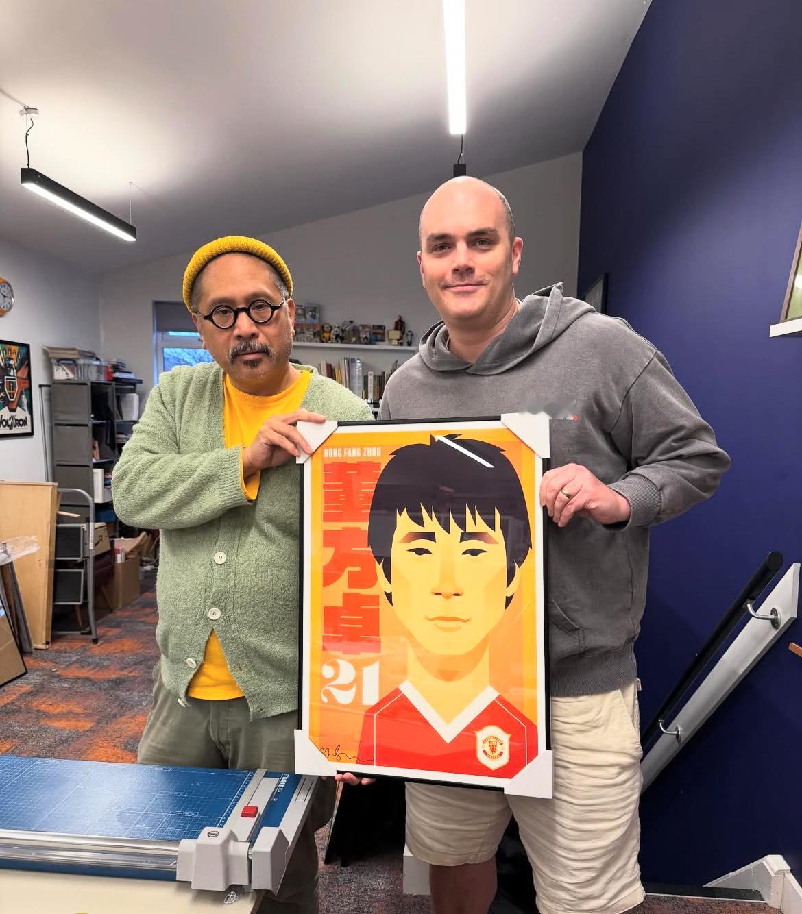一张纪念董方卓的插画很多曼联球迷应该都听说过Stanley Chow,他是曼联球迷,也是一位插画艺术家。他制作过很多曼联主题的作品,还和俱乐部合作推出过联名服饰。我自己很喜欢他的作品,经常搬运一些分享到中文社媒。前几天,BusbyWayPodcast(一个新兴的曼联球迷播客)和Stanley合作制作了这张董方卓的插画,纪念这位唯一效力过曼联的中国球员。但是他们犯了一个英文母语者常犯的错误,Fangzhuo拼错了,写成了Fangzhou,把图片放大就能看到。他们的语言逻辑里zhuo是很难发音的,zhou就简单多了,所以外国人遇见这种拼写就经常犯错。已经联系他们进行修改,希望过些天能送几幅画给董哥。挺好的一件小事。truered