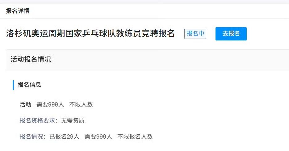 【国乒教练竞聘已有29人报名】国乒教练竞聘已报名29人近日,中国乒协官网发布发《中国乒乓球协会关于举行洛杉矶奥运周期国家乒乓球队教练员竞聘的通知》,其中提到,竞聘工作将通过公开报名、资格审核、竞聘陈述和答辩、评审委员会无记名投票以及最终结果公示等环节,产生总教练1人、副总教练1人、国家队男女队主教练各1人、国家青年队男女队主教练各1人、国家队教练员12人、国家青年队教练员10人。12月24日,在中国乒协报名页面看到,该报名页面显示已有29人报名。据了解,国乒此次教练竞聘最终将产生包括总教练在内的28名教练员。