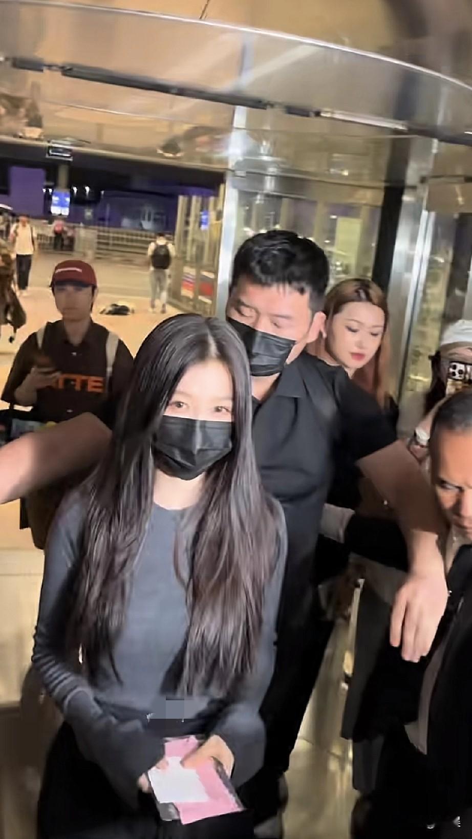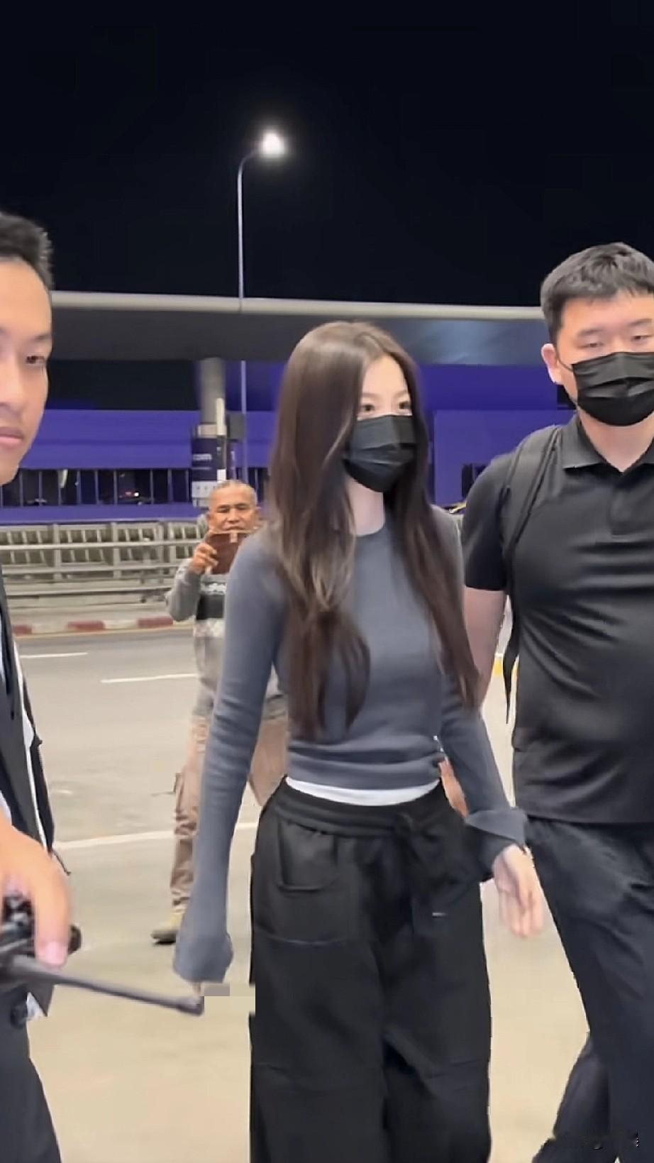 夜幕下的机场,虞书欣一身简约穿搭,灰色修身长袖内搭白色打底,搭配黑色休闲裤,长发披肩,口罩遮面也难掩清冷气质,在工作人员陪同下步履轻快