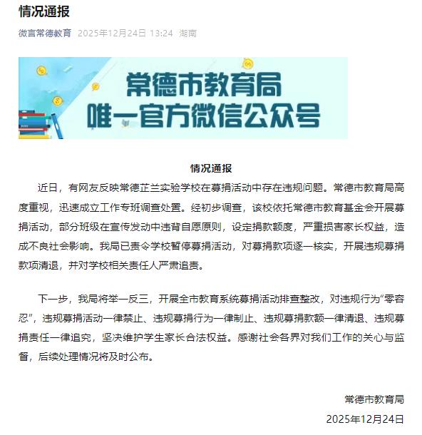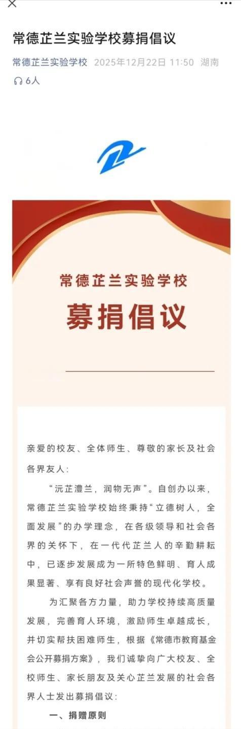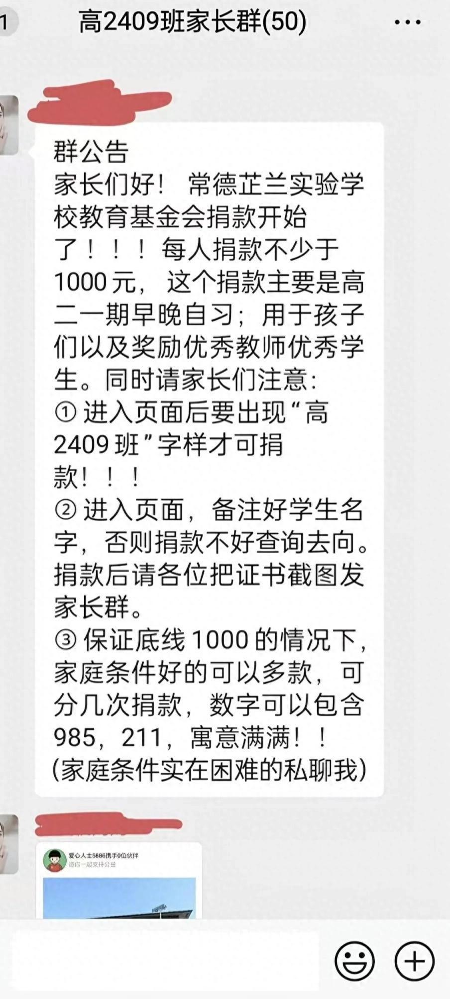 开口就是不少于1000元,这个号召捐款的学校吃相太难看。 近日,湖南常德芷兰实验学校一家长群中,有人号召家长为学校捐款。该通知发布人称,保底捐1000元,条件好的可以多捐,分开几次捐。更可笑的是,甚至还建议数额可包括985、211等寓意满满的数字。捐款的用途,主要用用于孩子们以及奖励优秀教师优秀学生。 从一些家长的截图来看,有些已经开始行动,有的直接捐了1000元,有的没有按照“友情揭示”要求,只捐了50元、100元等。 事情引起广泛关注后,常德市教育局对此进行回应,称该校在募捐活动中存在违规问题,部分班级在宣传发动中违背自愿原则,设定捐款额度,现在已经进行了处置,责令学校暂停募捐活动,对募捐款项逐一核实,开展违规募捐款项清退,并对学校相关责任人严肃追责。 对此,该校工作人员解释称,学校虽然发布了募捐公告,但并没有对捐款数额提要求,都是自愿的,是家长擅自发布的。 学校的说法没有撒谎,我也相信学校肯定不会提出明确要求,即便他们头脑再不清醒,断然也不敢那样做,这是常识问题,学校也不敢顶风违纪。不过,有些事情虽不见不得光,但是可以意会的,尤其是有些家委会成员,他们的领会能力超强,能够直白的知道学校想要什么。 家长捐完之后,还要保留截图上传,显然,这就是一种道德绑架,家长心里不愿意,也得乖乖照办,要不然孩子的鞋在学校里“不合脚”怎么办? 看了一下这个常德芷兰实验学校,是一所高中学校,在常德还颇具实力,虽然成立时间不长,但已经跃升至常德高中前五强。