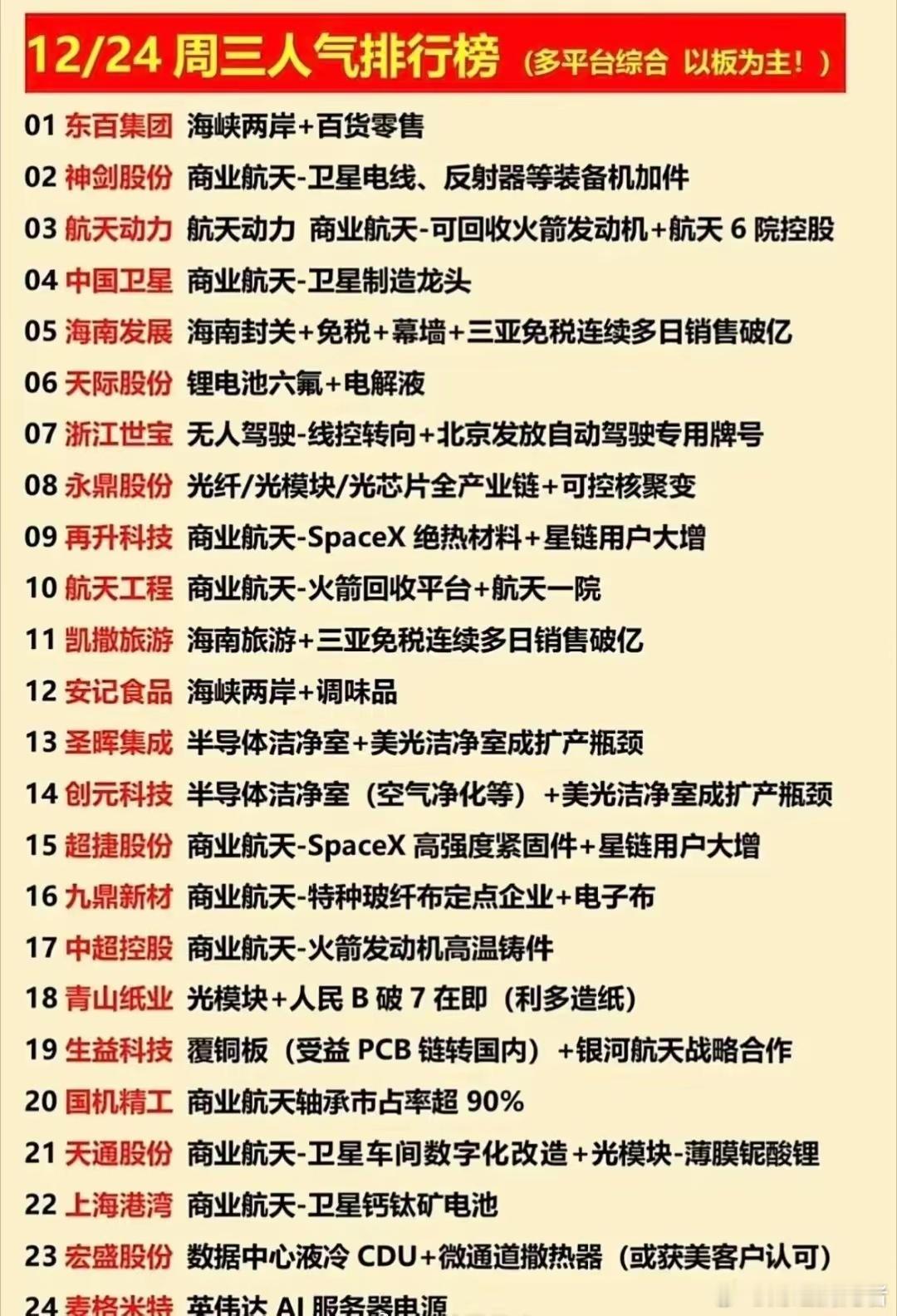 12月24日A股人气榜梳理分析今日市场人气聚焦商业航天绝对主线,超半数人气标的覆盖卫星制造、火箭发动机、配套材料/零部件全产业链;海峡两岸、海南封关/免税、半导体洁净室、无人驾驶等题材同步补涨,主线联动性与细分挖掘度较高。核心人气标的梳理1. 东百集团:人气榜首,海峡两岸+百货零售双题材加持,成区域消费人气标杆。2. 商业航天核心梯队:神剑股份(卫星装备)、航天动力(火箭发动机)、中国卫星(卫星制造龙头)、再升科技(航天绝热材料)、航天工程(火箭回收)、超捷股份(航天紧固件)、国机精工(航天轴承龙头)等,凭借产业链核心地位领跑人气。3. 区域题材代表:海南发展(海南封关+免税)、安记食品(海峡两岸+调味品),借区域政策热度获关注。4. 科技&新能源补涨:圣晖集成/创元科技(半导体洁净室)、浙江世宝(无人驾驶)、天际股份(锂电电解液)、麦格米特(AI服务器电源)等,为细分赛道人气标的。总结市场人气完全锚定商业航天主线,人气标的筛选紧扣产业链地位与消息催化;海峡两岸、海南等仅为补涨分支。后续需关注商业航天主线持续性及细分赛道轮动节奏。今日看盘上证指数a股