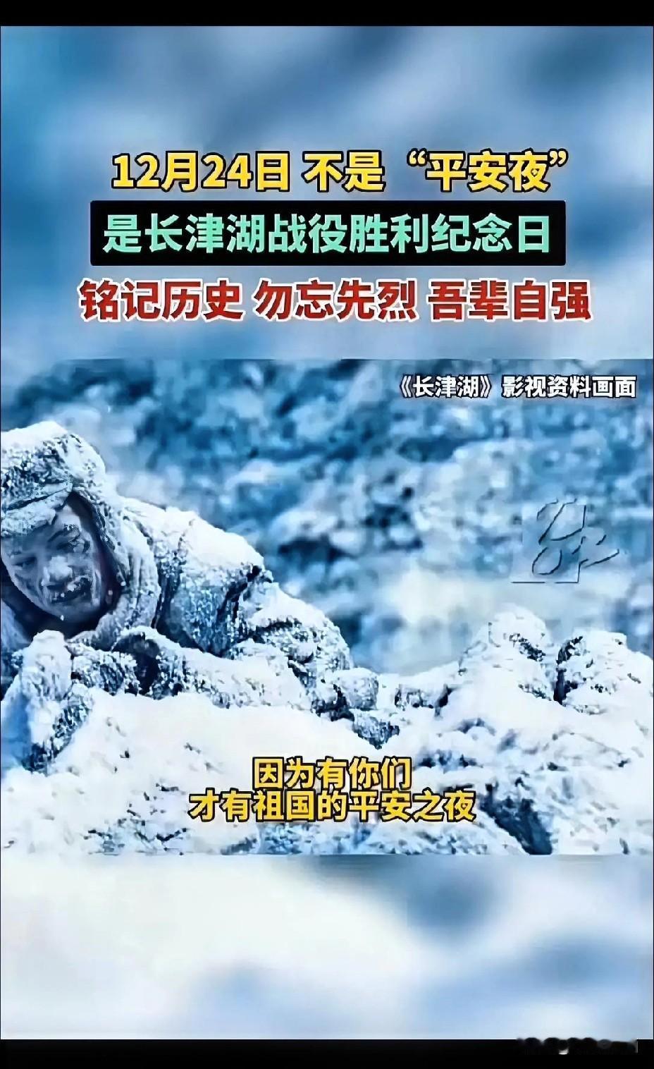 长津湖之后,再无西方节日平安夜! 美国人的平安夜是上帝给的,我们平安夜是志愿军战士给的。 12月24日是抗美援朝长津湖战役胜利的日子,志愿军在零下40℃的极寒环境中,身着单薄棉衣,与装备精良的美军展开殊死较量。 “冰雕连”战士以战斗姿态冻死在阵地上,展现了视死如归的英勇精神。 给我们带来平安的不是圣诞老人,也不是平安夜,是无数先烈的浴血奋战,抛头颅,洒热血的壮举带来的,让我们铭记历史,铭记这一天,勿忘先烈! 长津湖胜利的日子才是真正的平安日!!! 中国的万年历上就应该把12月24标志成抗美援朝长津湖胜利纪念日! 致敬抗日英雄!致敬革命先烈!