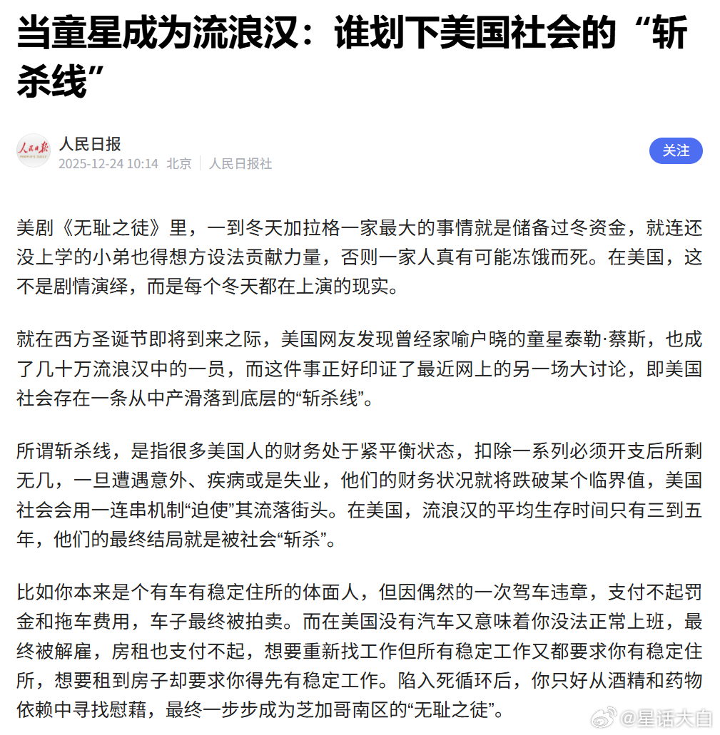 关于美国的“斩杀线”,还有一个反直觉的信息。就是这个“斩杀线”,还不单单只针对底层民众,还针对美国中产。这里的斩杀线,其实就是指,美国中产可能因为一次突发意外,在短时间内从有车有房,变成路边流浪汉,就会因此失去工作,出现阶级滑落。并且按照美国的社会达尔文氛围,一旦一个人出现阶级滑落,就很难再爬回去,也就是美国的中产一旦变成流浪汉,基本没有可能靠自己爬回中产,会被美国社会的一套连造,一波带走。比如,美国最近就出现一件事情,曾经家喻户晓的童星泰勒·蔡斯,也成了几十万流浪汉中的一员,这就是典型的触发了斩杀线,阶级滑落的案例。这个美国中产斩杀线触发的可能性有很多,比如被裁员、生一场大病、遭遇电诈等等,一旦碰到这种情况,这个美国人可能无法继续支付房贷,房子就会被收走。然后很关键一个问题是,在美国,没有固定住所是找不到工作的,起码是找不到正式工作,顶多打打黑工。这里关键原因是,美国是没有身份证制度,所以企业一般都会要求员工要有固定住所,来作为社会背景的背书。所以,在美国一旦失去房子,也租不起房子,没有了固定住所,成为了流浪汉,就意味着找不到工作。就像报道里说的:“想要重新找工作但所有稳定工作又都要求你有稳定住所,想要租到房子却要求你得先有稳定工作。陷入死循环后,你只好从酒精和药物依赖中寻找慰藉,最终一步步成为芝加哥南区的“无耻之徒”。”