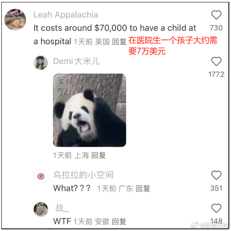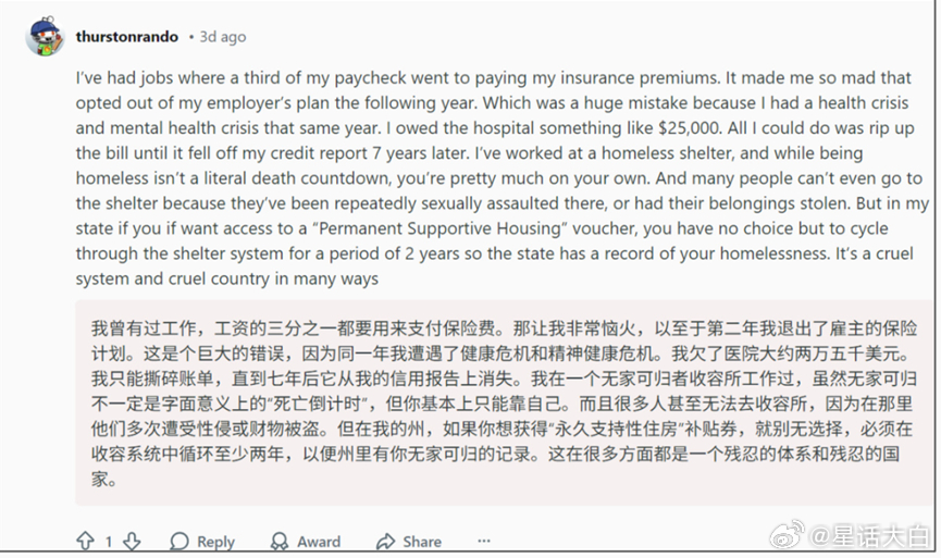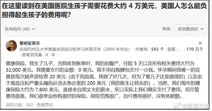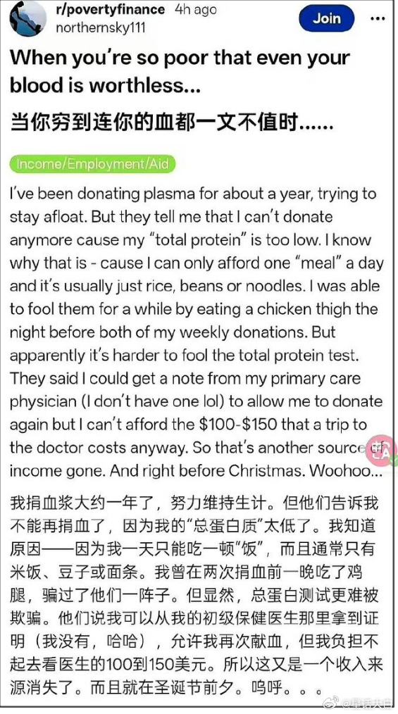 关于“斩杀线”的说法在我们网络流行后,开始出口到美国,然后很多美国人也开始现身说法,认同“斩杀线”的说法。比如有个美国人说他曾经的工作,工资1/3用来支付保险费,他非常恼火,于是第二年就退出这个保险计划,但他很倒霉的是,他退出保险计划后,就遭遇健康危机,欠了医院2.5万美元费用,他花了7年才把这个违约记录从信用报告上消失。关于美国高昂的医疗费用,在年初中美网友大对账里,我也有单独写文章分析过。有个美国网友说:“在医院生一个孩子大约需要7万美元”,这个让不少中国网友感到震惊。我还特意去查了下这件事情的真伪。在美国问答网站上,一个2020年的问题是“在这里读到,在美国医院生孩子需要花费大约4万美元,美国人怎么能负担得起生孩子的费用呢?”有个人回答是“健康保险”,他4年前生孩子费用是3.2万美元,然后由保险都报销了,但他每年需要支付7800美元的健康保险。考虑到这是2020年的问题了,我就搜了下近期情况。刚好有个美国人在2024年3月30日,晒了她生孩子的费用清单是6.5万美元。她提到:“不包括我的医生费、麻醉师费、我儿子的儿科医生费或来医院探望我儿子的医生的账单,我们两人的住院费用总计为 64998.43 美元。”她还提到:“生孩子的总费用超过7万美元,其中我已经支付了大约4500 美元,我的保险支付了其余部分。我仍然收到我应负责的账单。几个月前我收到了一张 600 美元的账单。说实话,我现在很害怕去邮箱。”可见,即使她的保险报销完,生孩子费用对她来说仍然是一个很大的负担。短短4年时间,美国生孩子的费用就从4万美元飙升到6.5万美元,这也是过去4年美国高通胀的一个体现。基本上美国过去4年,大多数物价都上涨了50%以上。所以,这次美国网友说现在美国生孩子要7万美元,应该是真的。还有个美国网友晒她在急诊室3个小时的总费用是1.79万美元。美国医疗也是出了名的昂贵,所以美国人基本都得买高额的商业医疗保险。但商业医疗保险又很贵,像上面那个美国老哥说的,他的保险费用占了他1/3工资,不买还不行。这些刚性支出把美国人的高收入占据了大部分。甚至一些美国人需要靠卖血来维持生计。乃至都出现“卖血请朋友喝星巴克”这样的说法。还有一些“全款买菜”、“助学贷款利滚利”,这类我们很多人都想象不到的名词。此外,很多人美国人也证实,需要有固定住所才能找到工作的说法。所以,其实身份证制度是非常有必要的,这是国家来为我们每个人背书,普通工作的企业只需要知道身份证号,不需要有固定住所,就能找到工作,而这在美国成了一种奢望。很多我们觉得理所当然的事情,在不少美国人眼里都成了奢望。