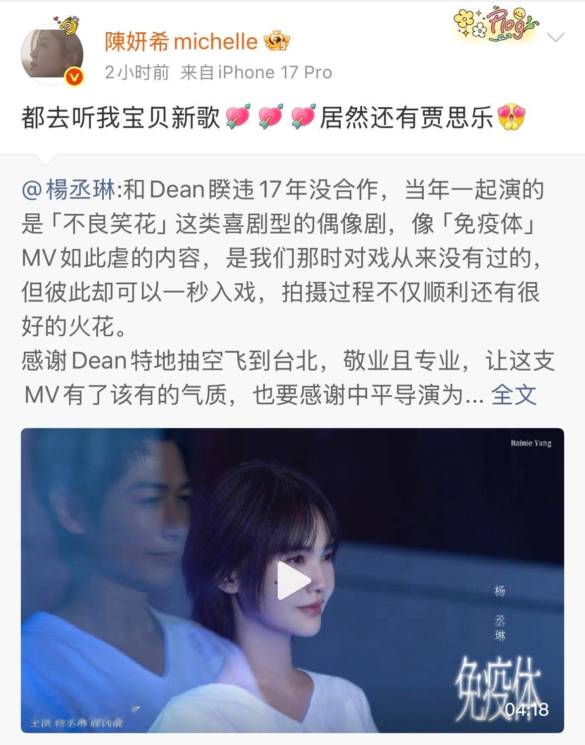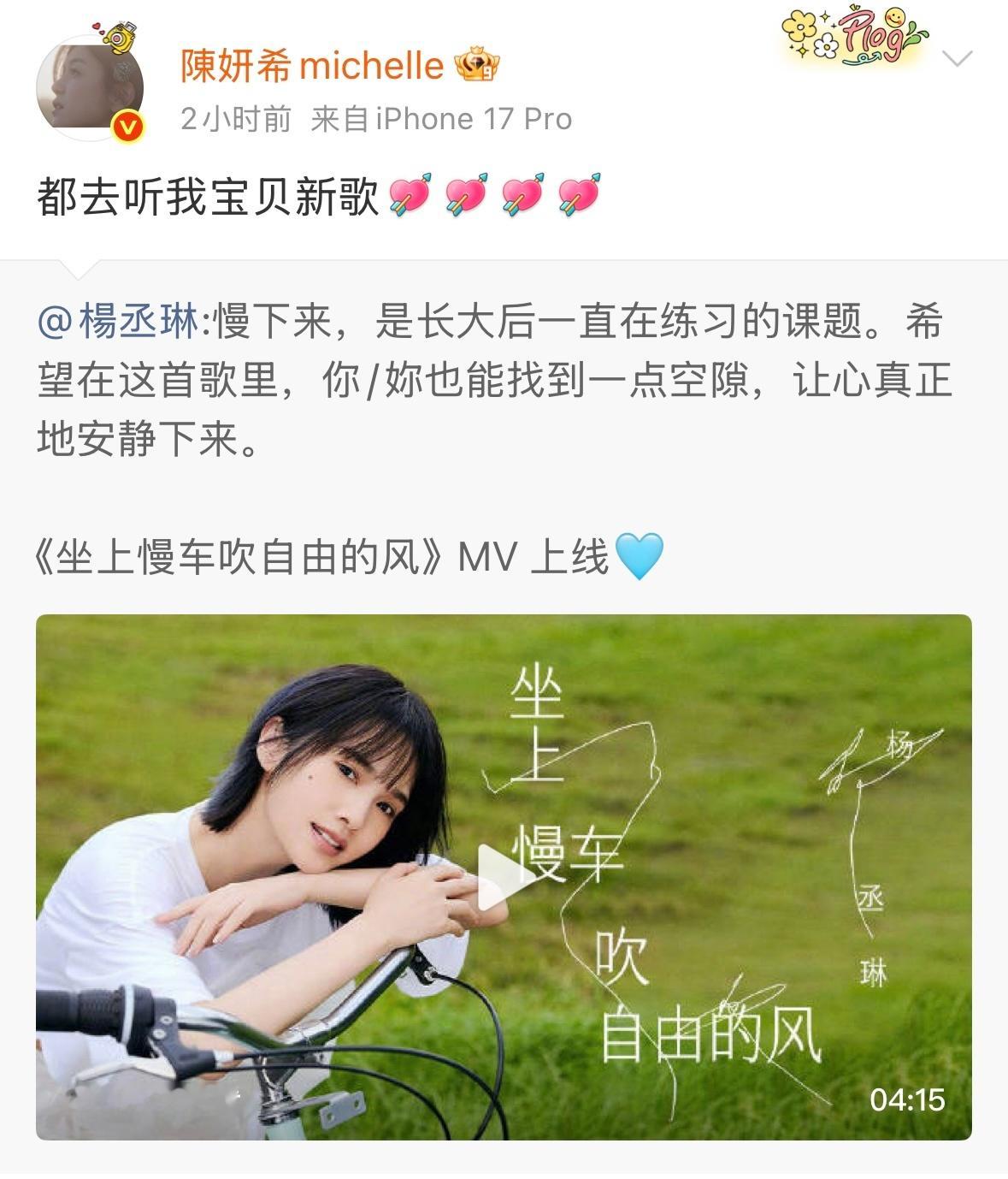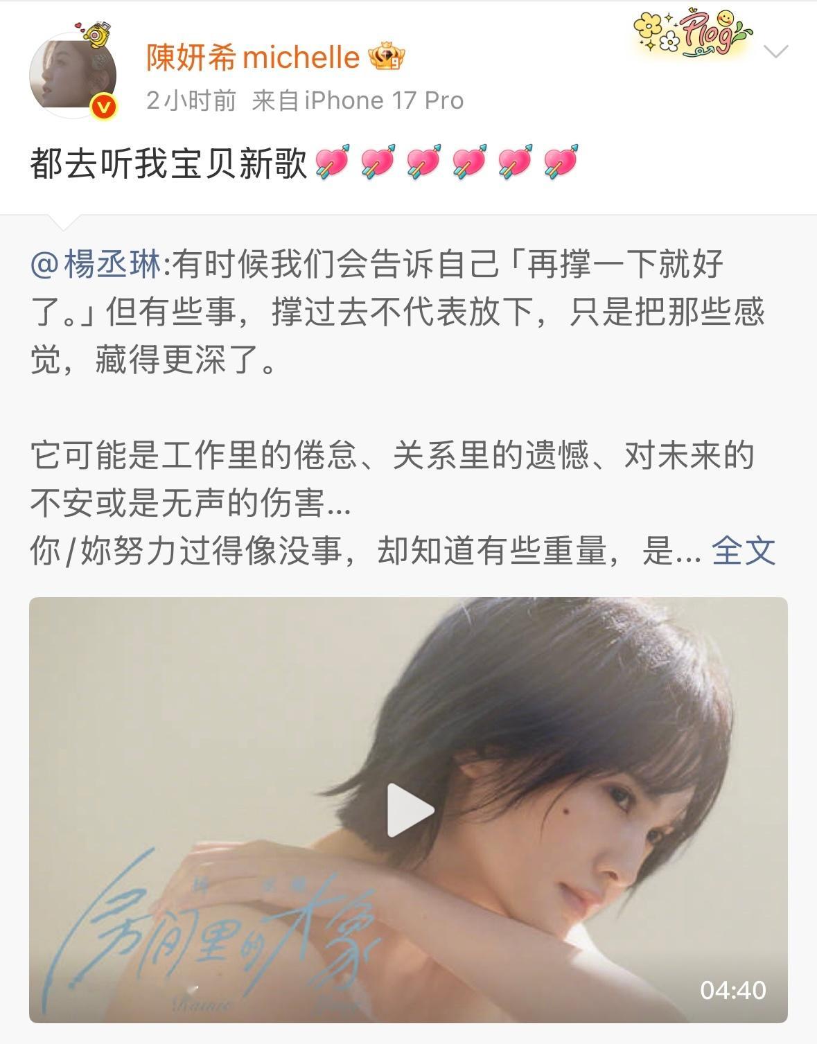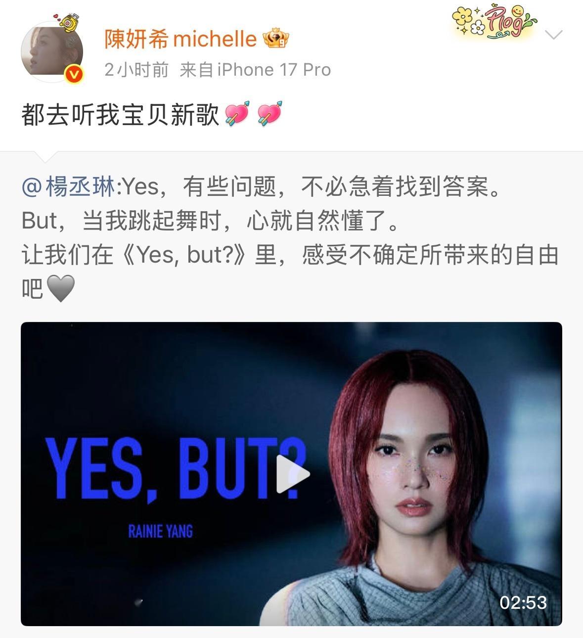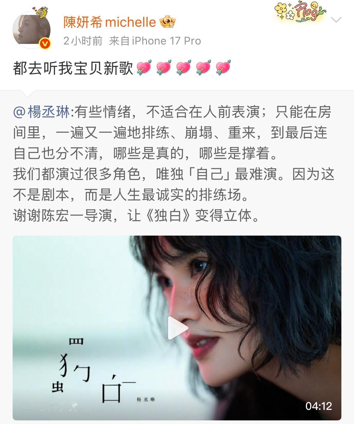 陈妍希真是绝好的Bestie!在自己凭借《狙击蝴蝶》爆火以后,刚刚把好闺蜜杨丞琳新专辑《有且》拍摄的6支MV全转了一遍,都附言“都去听我宝贝新歌”自己有热度不是忙着独自飞升,而是趁着自己的热度再帮多年好友的新作品加热一把这份支持也是双向的,之前陈妍希婚变,杨丞琳受访也是表示陈妍希有自己处理事情的节奏,自己作为好朋友无论如何会一直在身边支持她都很好!都很好!