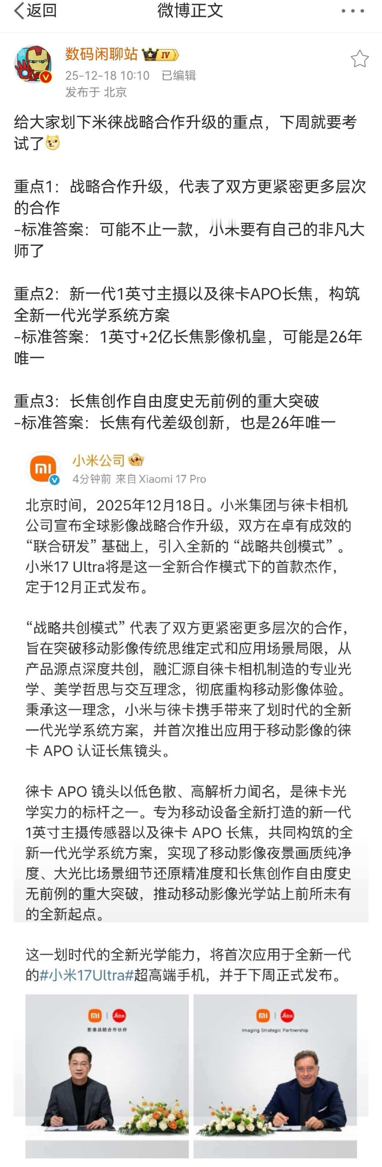 小米17Ultra徕卡版售价或过万 小米17 Ultra这次真是徕卡手机了,回头看看leitzphone都过万,现在说过万还真不意外。机械变焦环和徕卡logo的专属设计,算下来就得加两千块,国内过万、海外更贵基本没跑了。徕卡版定价高了,标准版才有存在感,不在乎价钱的冲徕卡版,觉得贵的还有标准版可选,分工清清楚楚。站哥都提过,徕卡版就是小米自己的非凡大师,今年高端化步子确实挺猛。再说增配和内存涨价的影响,标准版12+256起步价定在6999,这个位置也算合理。整体来看,产品线分得明白,定价也各有道理。