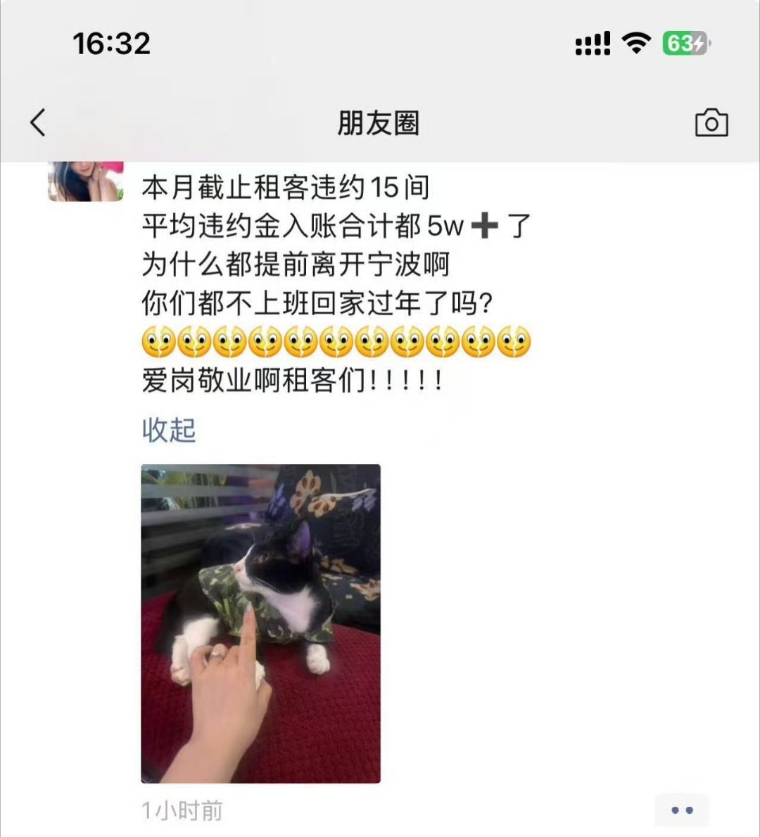宁波房东称年底许多租客违约赔钱提前走了 ,平均违约金都收入5w十了…宁波房东在朋友圈发文:本月截止租客违约15间平均违约金入账合计都5w十了…为什么都提前离开宁波啊你们都不上班回家过年了吗?爱岗敬业啊租客们!!!!!大家今年都要提前回家了吗!