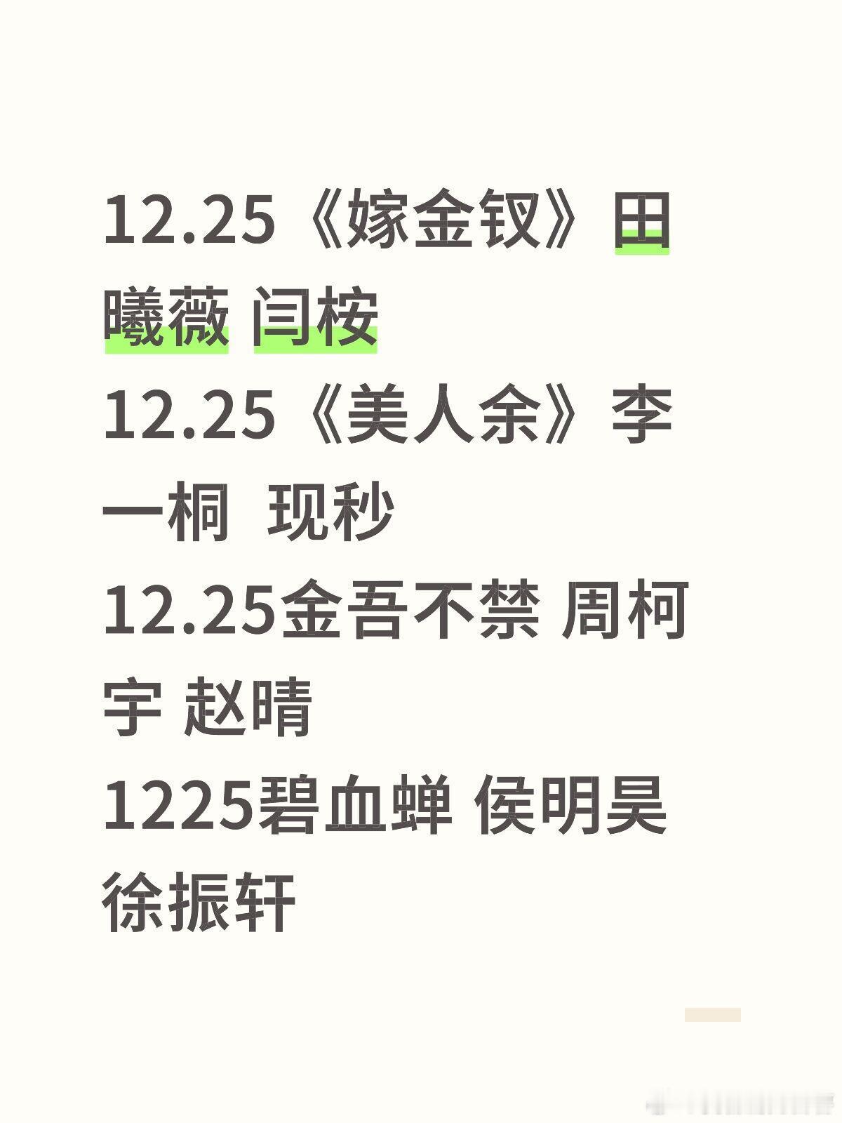 1225碧血蝉12.25《嫁金钗》田曦薇 闫桉12.25《美人余》李一桐 现秒12.25金吾不禁 周柯宇 赵晴1225碧血蝉 侯明昊 徐振轩