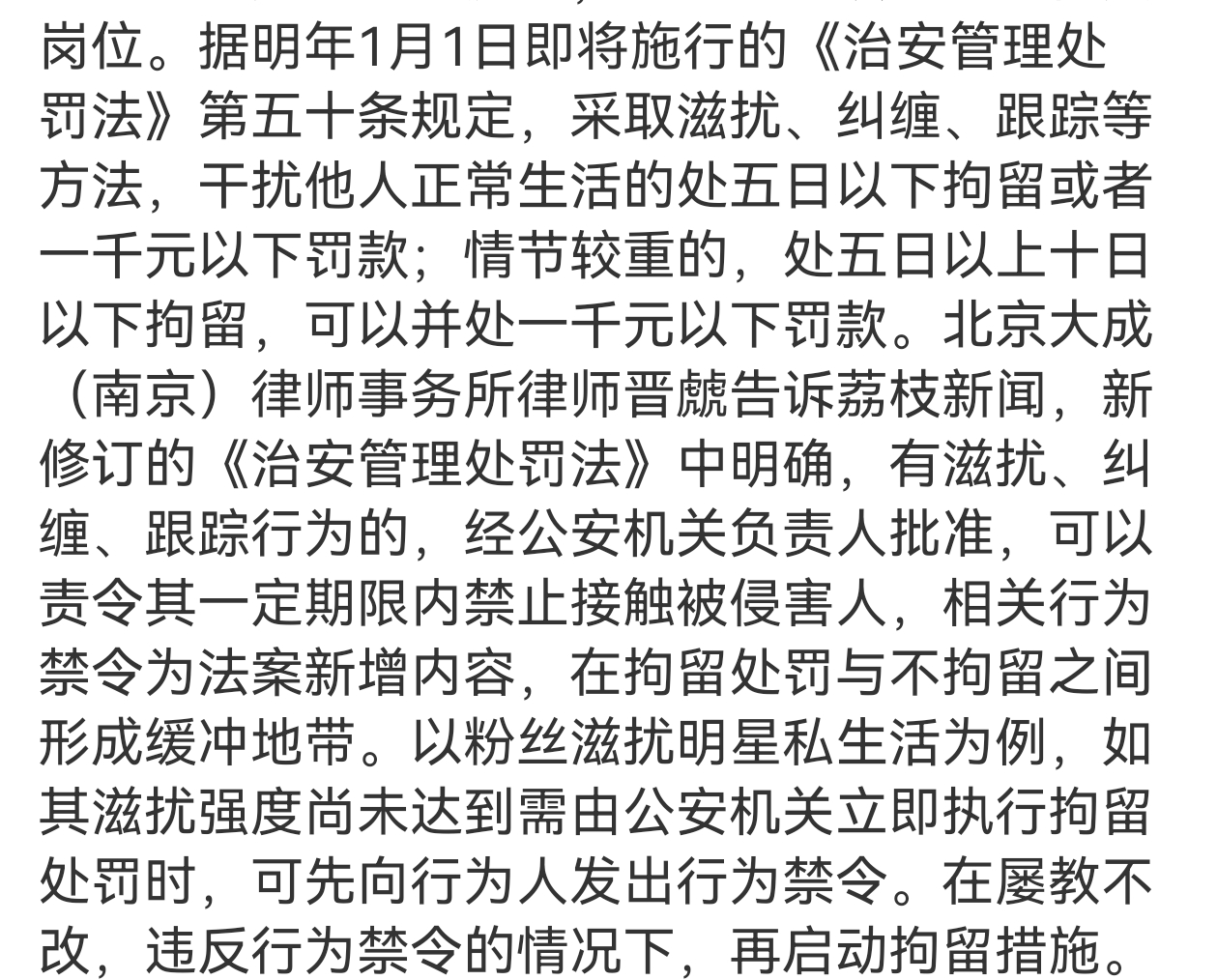 明年起私生粉滋扰纠缠明星明确违法 明年1月1日即将施行的《治安管理处罚法》第五十条规定,采取滋扰、纠缠、跟踪等方法,干扰他人正常生活的处五日以下拘留或者一千元以下罚款;情节较重的,处五日以上十日以下拘留,可以并处一千元以下罚款。以粉丝滋扰明星私生活为例,如其滋扰强度尚未达到需由公安机关立即执行拘留处罚时,可先向行为人发出行为禁令。在屡教不改,违反行为禁令的情况下,再启动拘留措施。