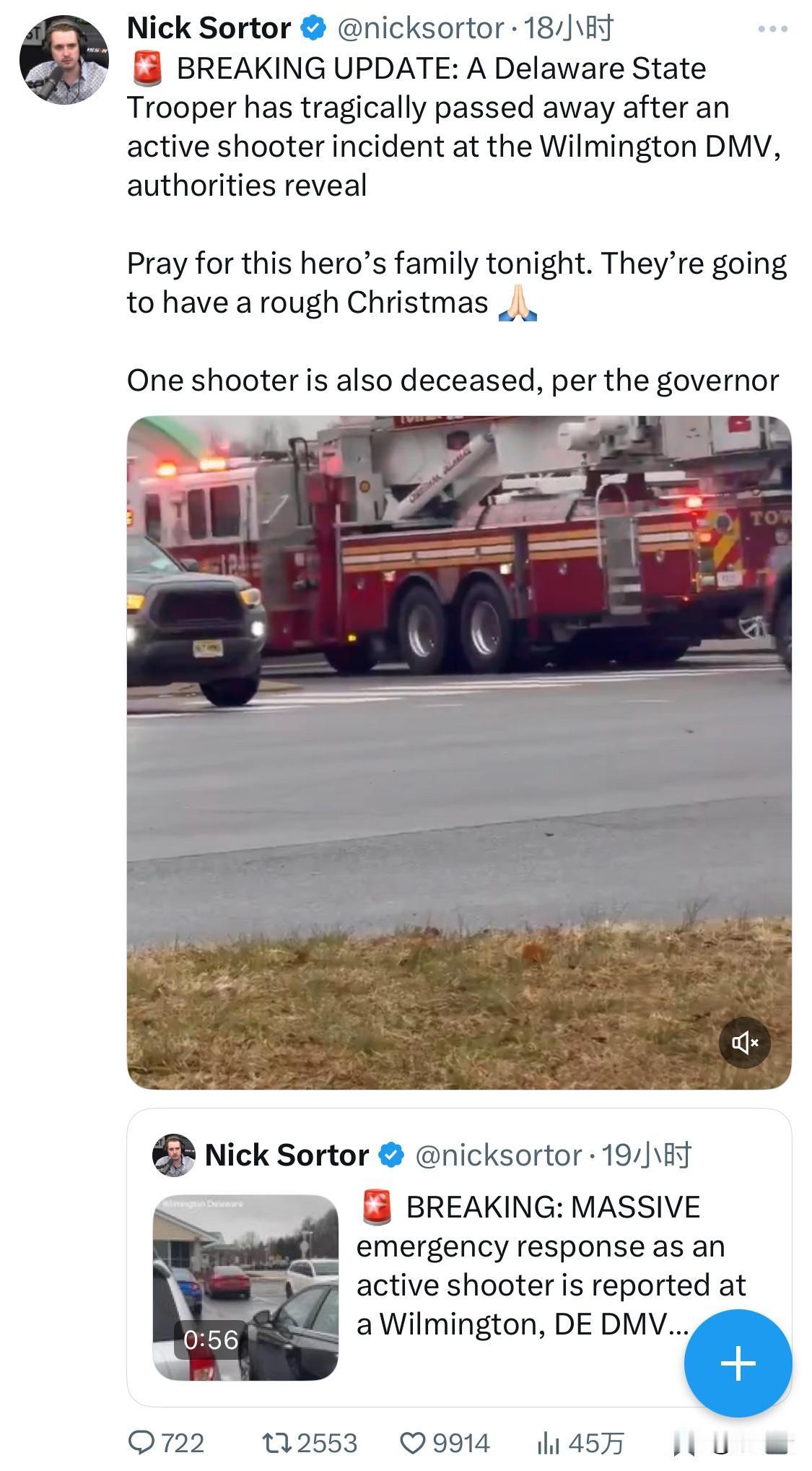 最新消息:2025年12月23日(当地时间),美国特拉华州威尔明顿市(Wilmington)附近的机动车辆管理局(DMV)发生一起致命枪击事件,导致一名州警死亡,枪手也被当场击毙。 出事地点位于威尔明顿南部 Hessler Boulevard 的 Karen L. Johnson 机动车辆管理局(DMV)大楼。 一名44岁男子以顾客身份进入大厅,走向前台接待处,向一名正在值加班班次的州警开火。 警方表示,该州警在身中第一枪后,仍奋力将一名身边的DMV工作人员推向安全地带,随后被枪手再次射击并身受致命伤。 随后赶到的新卡斯尔县(New Castle County)警察与枪手交火并将其击毙。