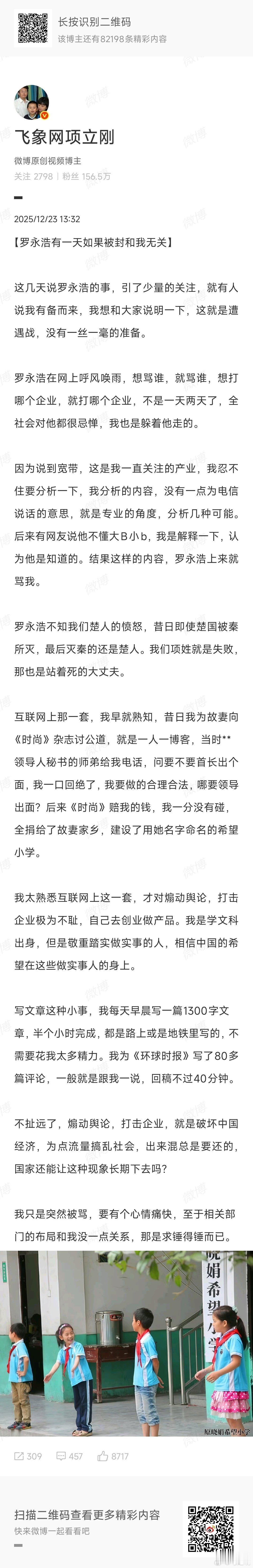 晚上做了一点功课,验证里一下项立刚说罗永浩“想骂谁就骂谁”是不是事实。从已查到的资料显示,没看到罗胖子骂人。有“热心”网民提醒,1、罗胖子“骂了”俞敏洪;2、罗胖子“骂了”西贝董事长贾国龙;3、罗胖子骂了项立刚。首先,俞敏洪是我尊敬的企业家,罗永浩曾经在他手下工作,罗永浩对俞敏洪的评价总体还是很不错的。如果脱离具体语境,罗胖子使用“铁公鸡”,“龌龊”两个词,给外人的感觉的确不雅,但,远没有达到骂人的程度。这应属于前雇主与雇员的“相亲相杀”,将其定性为“罗永浩想骂谁就骂谁”,显然站不住脚。其次,贾国龙是谁?在此之前我根本不知道他是谁,更对西贝是啥也不太清楚,还是“热心”网民给我“普及”了罗胖子和西贝之间的那些事。可翻看罗胖子的微博和有关媒体和自媒体的文章,是真没发现罗胖子骂贾国龙,而是罗胖子就因到西贝吃了一顿饭,吐了一个槽,顺便想要个消费者的知情权,这算是“骂人”?好家伙,消费者这个“上帝”,被上帝的上帝用上帝的视角给蔑视了,罗胖子也就成了骂人的那个人了,只是这些看似站队西贝的网民,是真对贾董事长好,还是架秧子起哄呢?不好说。再次,说罗永浩骂了项立刚,这事儿是当下热点,罗永浩骂没有骂项立刚,仁者见仁,智者见智,全凭个人口味判断,就不再赘述。只是项立刚连续发布13篇文章,指控罗永浩“没有爱国情怀”、“创业失败是活该”、“心比天高命比纸薄”,甚至将其比作“唱二人转的”这算啥?坦率说,罗永浩的一些用词(如“智障”)确实不够文明,这应属于网络对喷中的“互骂”,但项立刚老师将其单方面定义为罗永浩在“恃强凌弱”或“想骂谁就骂谁”,显然是颠倒了因果。要说罗胖子骂人,他说方舟子是“骗子”,不知这个算不算?当年,他曾经给方舟子的什么基金会捐了1000块钱,那个什么律师说会公布捐款的账目,可他们食言而肥。罗胖子追着方舟子讨要说法,就是那个时不时提裤子的视频记录的事儿,挺搞笑。后来那个法院判那个什么律师退捐赠款,这个事实也不能省略吧?时至今日,项立刚说罗永浩“骂人”也没拿出啥具体的实证,只查到这些,没有罗胖骂人的资料。不知,项立刚能不能展示一下罗永浩“骂人”的材料。不能只控诉,没实证吧?如果项立刚老师非要站在道德高地,指责罗永浩的语言风格,那就该心平气和的具体问题具体分析,不能说罗永浩想骂谁就骂谁吧?