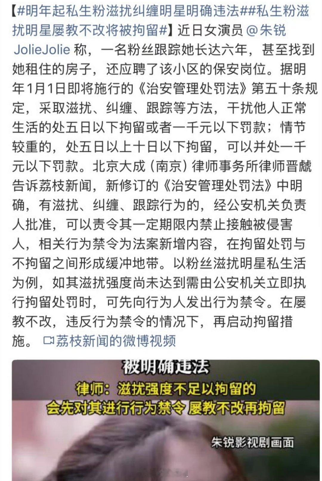 从明年开始私生滋扰纠缠明星,已经被明确为是违法了,这个法律上的确定,应该能够在很大程度上限制私生的行为了,受到滋扰的艺人可以直接报警处理