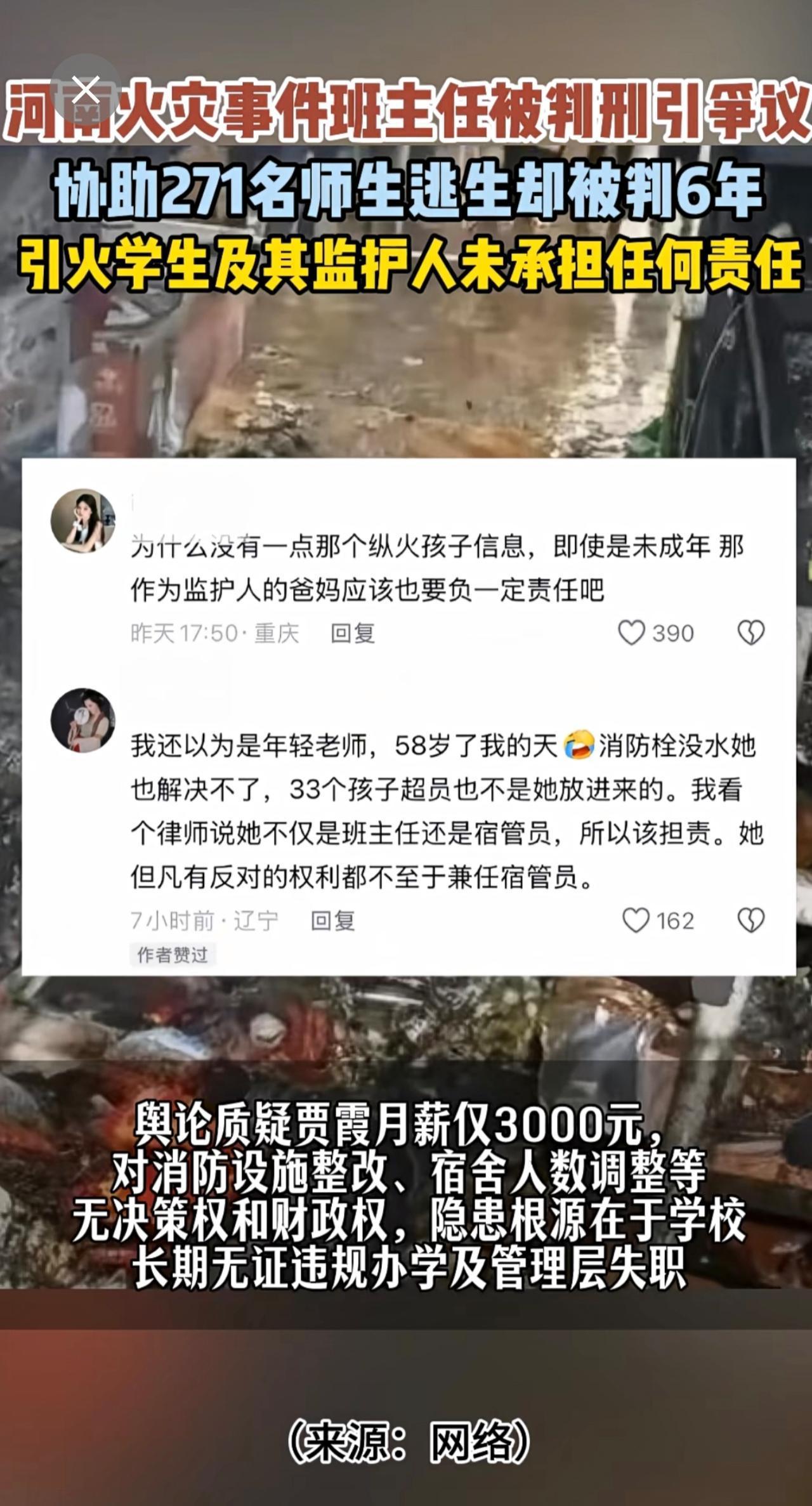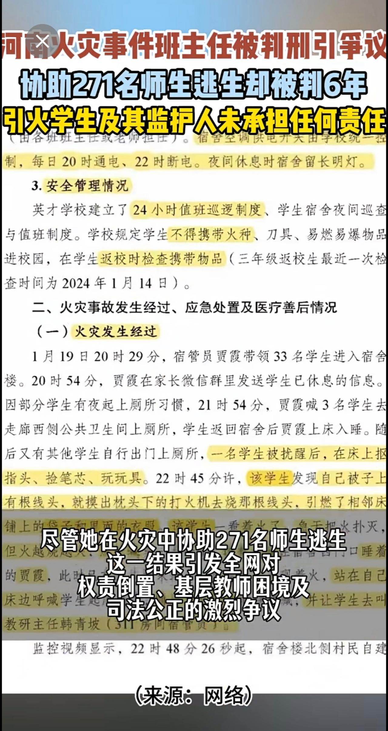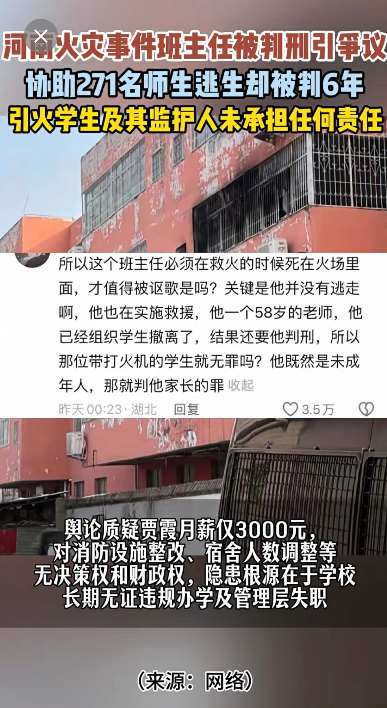 河南火灾事件班主任被判刑引争议,协助271名师生逃生却被判6年,引火学生及其监护人未承担任何责任与赔偿