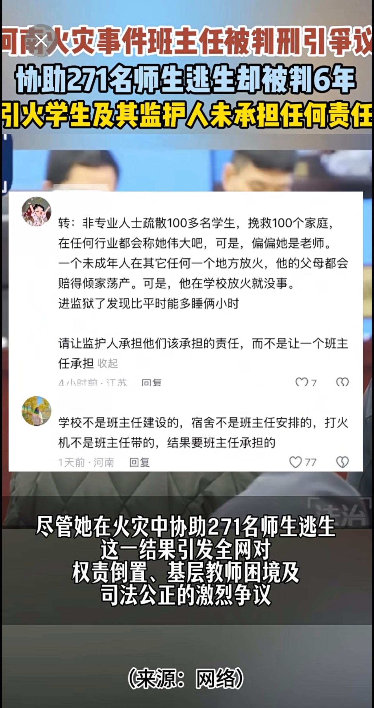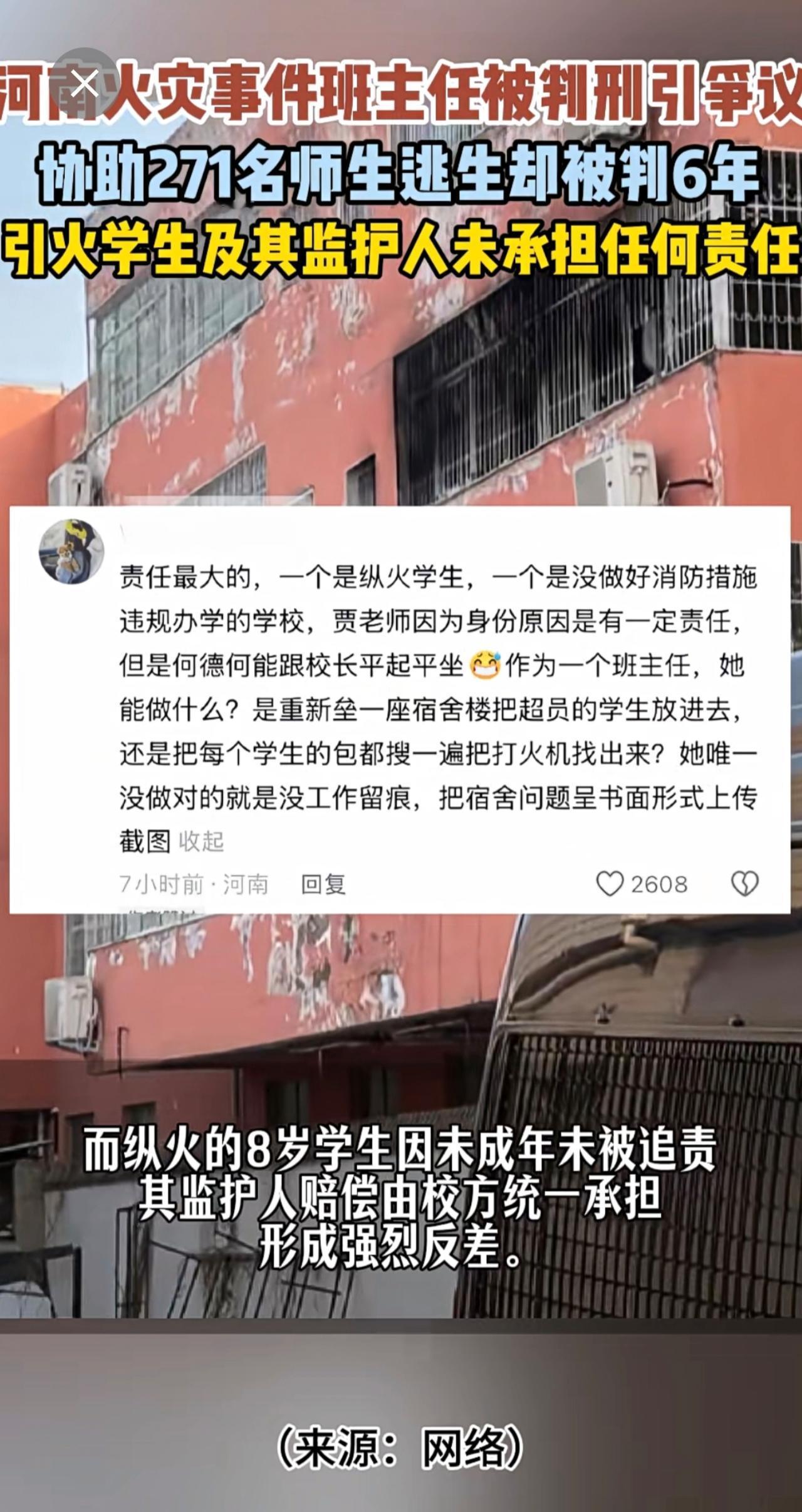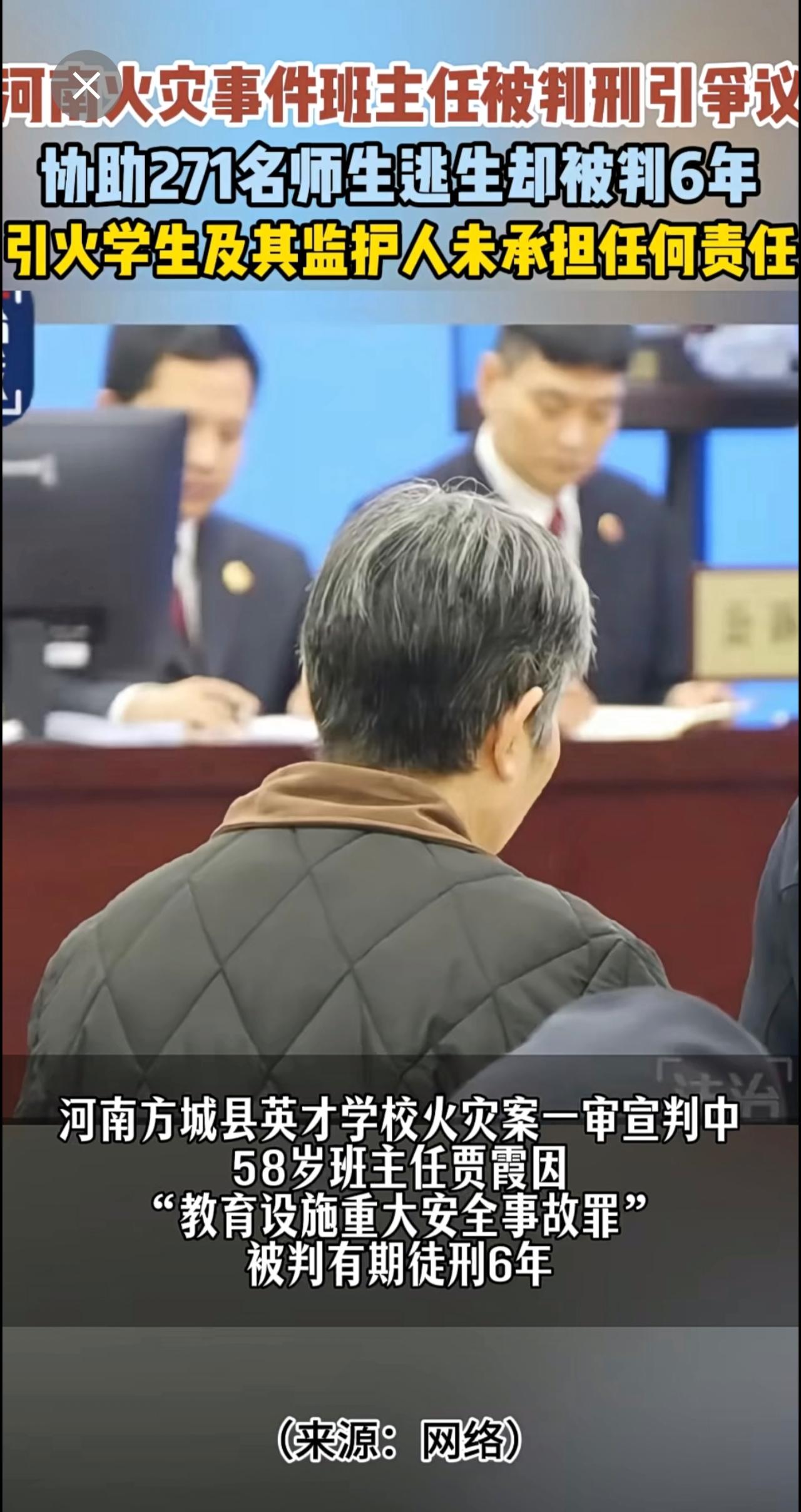 河南火灾事件班主任被判刑引争议,协助271名师生逃生却被判6年,引火学生及其监护人未承担任何责任与赔偿