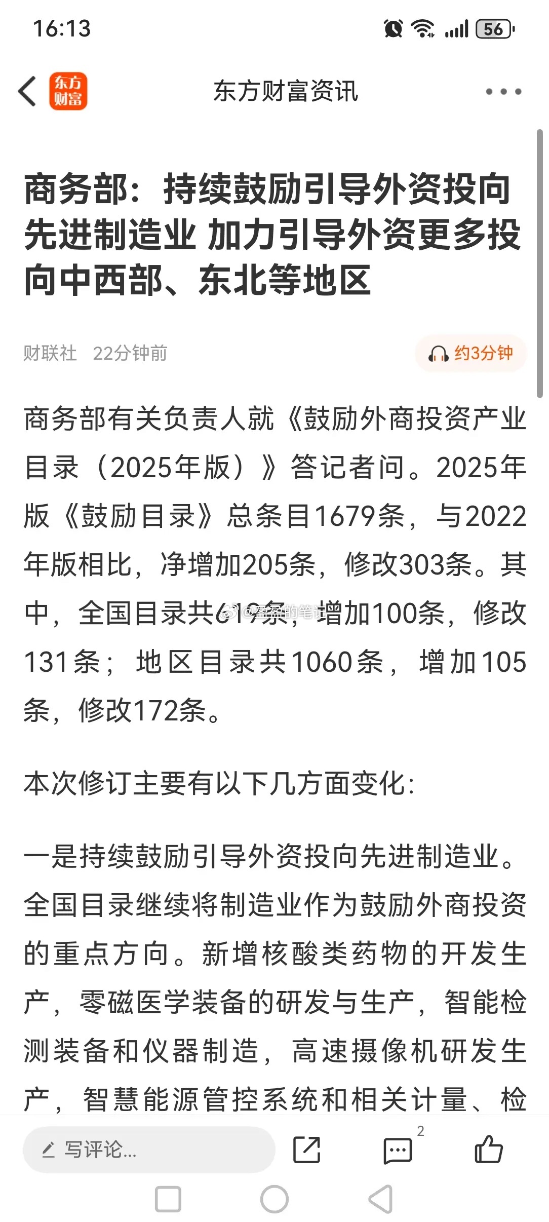 盘后传来三大重要消息,或影响明天A股相关走势。消息一,今日港股三大指数集体迎来了上涨,其中恒生科技指数上涨0.19%。若港股有持续稳定的表现,将积极影响A股。消息二,央行等多部门联合发布了《关于金融支持加快西部陆海新通道建设的意见》。这有将有力的支持西部大开发,为西部大开发带来更多投资资金。更好更快的建设西部经济。消息三,商务部指出,持续鼓励引导外资投向先进制造业。这有利于提升先进制造业的竞争力,为先进制造业带来投资资产。对此你们怎么看?