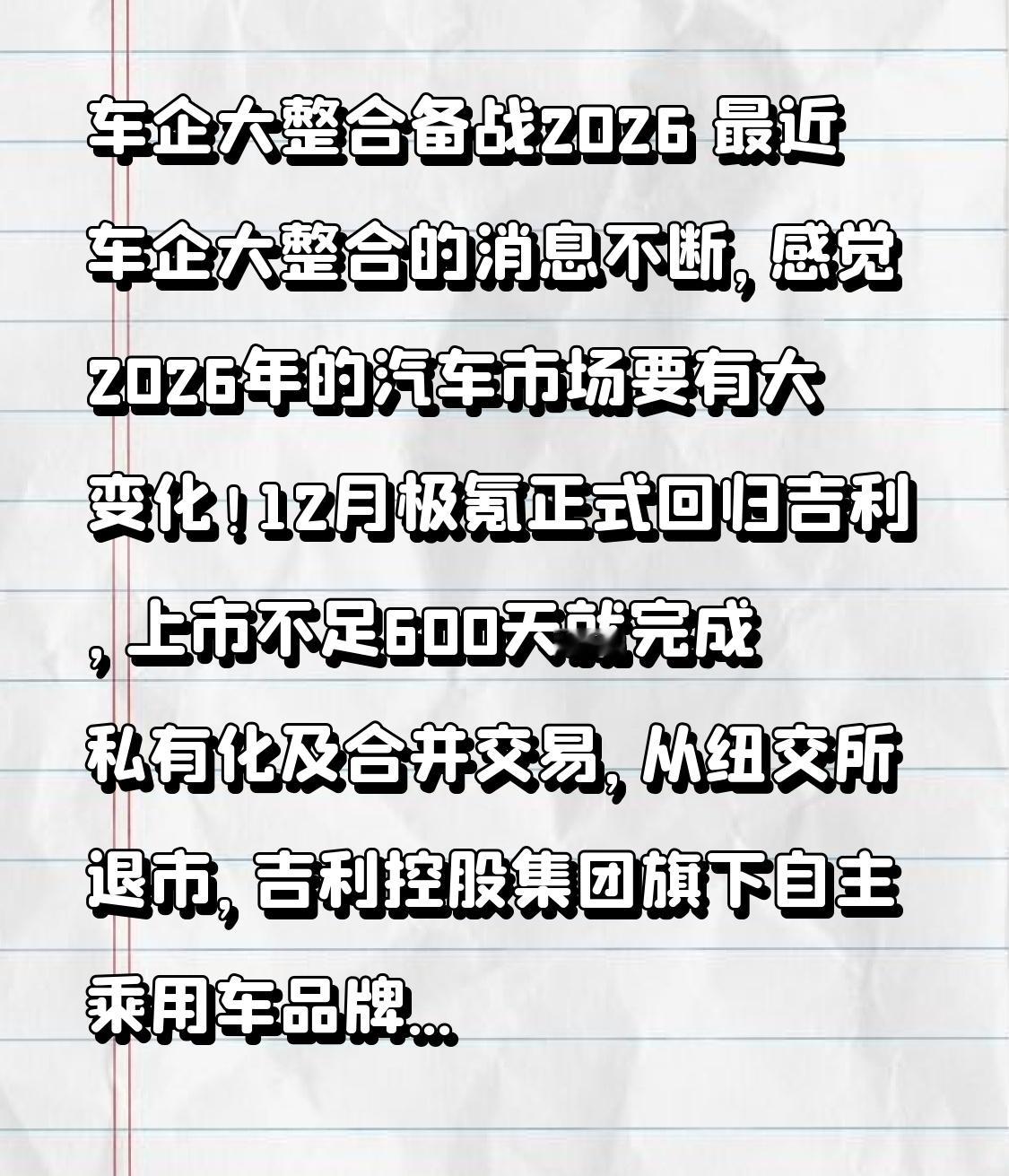 车企大整合备战2026 最近车企大整合的消息不断,感觉2026年的汽车市场要有大变化!12月极氪正式回归吉利,上市不足600天就完成私有化及合并交易,从纽交所退市,吉利控股集团旗下自主乘用车品牌缩减至4个,全归吉利汽车。这改变了过去“品牌小而散、散而乱”的现象,能把资源凝聚成“一个拳头”。