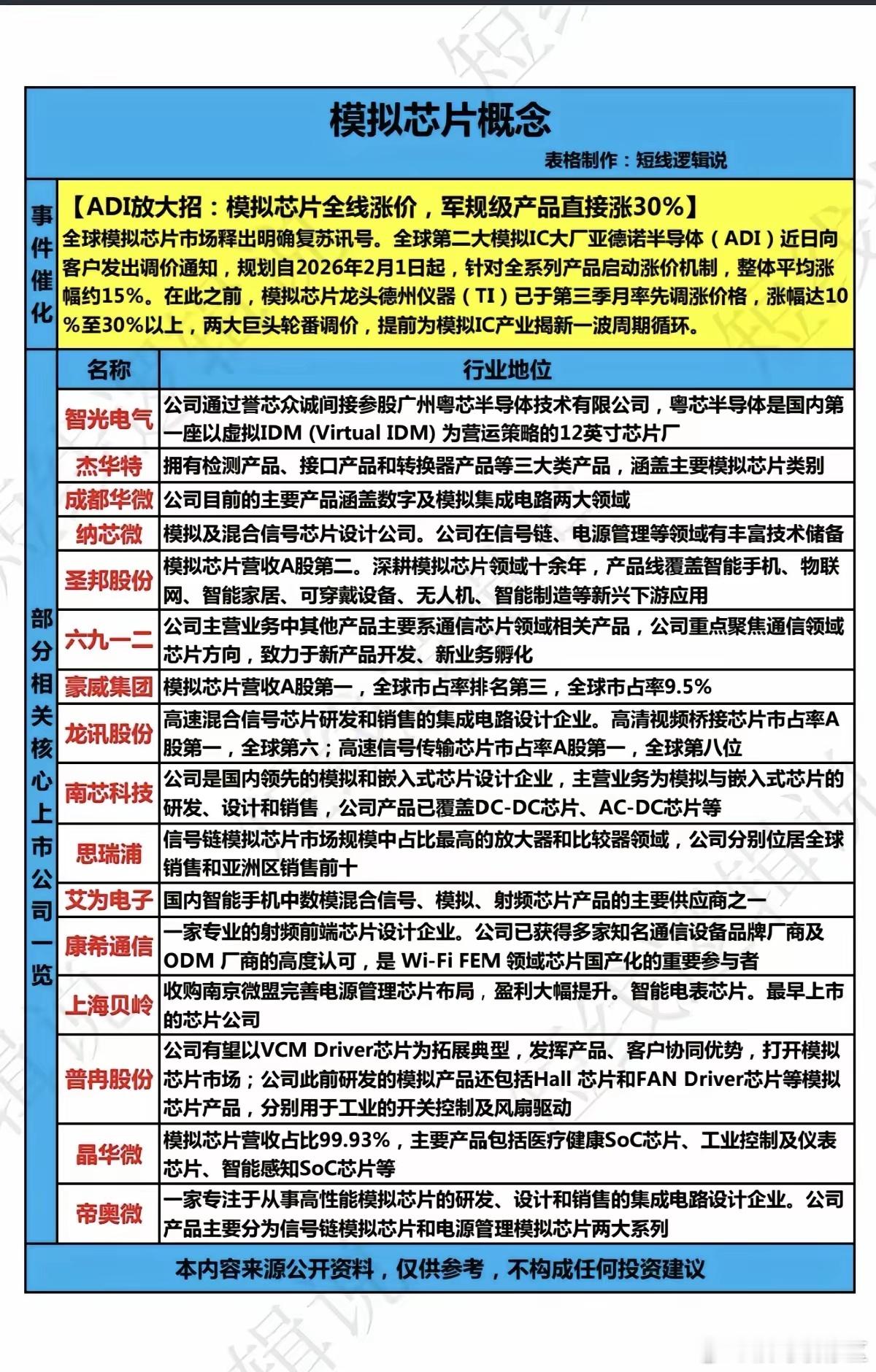 模拟芯片全线涨价!军规级产品涨价30%。全球第二大规模IC大厂亚德诺半导体ADI向客户发出调价通知,自2026年2月1日起,至少涨价15%
