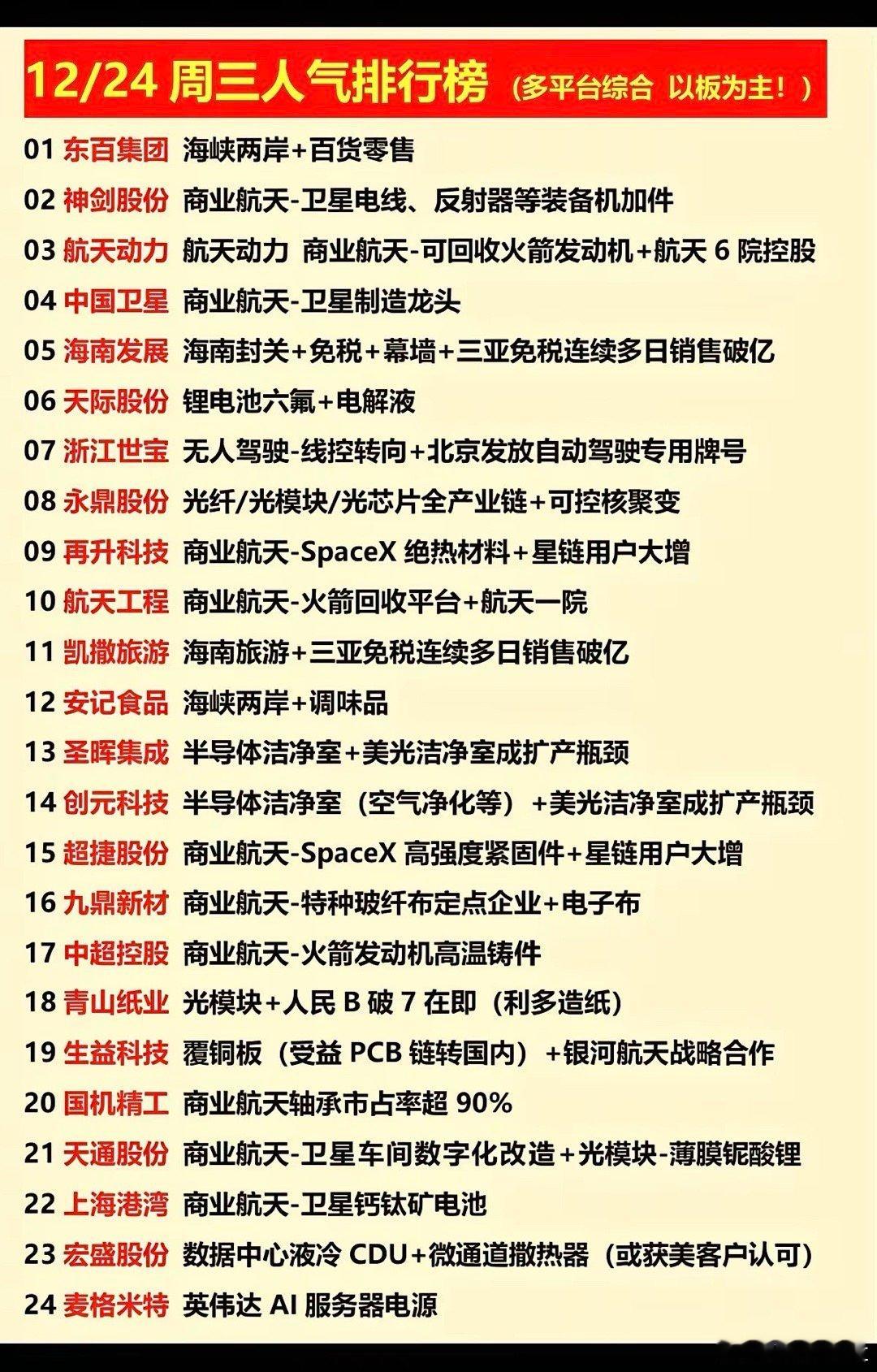 12/24周三 涨停板股票:人气龙虎榜!1.商业航天+卫星天线+发射器2.光纤光模块,电子布3.六氟磷酸锂电解液4.半导体洁净室5.液冷,数据中心