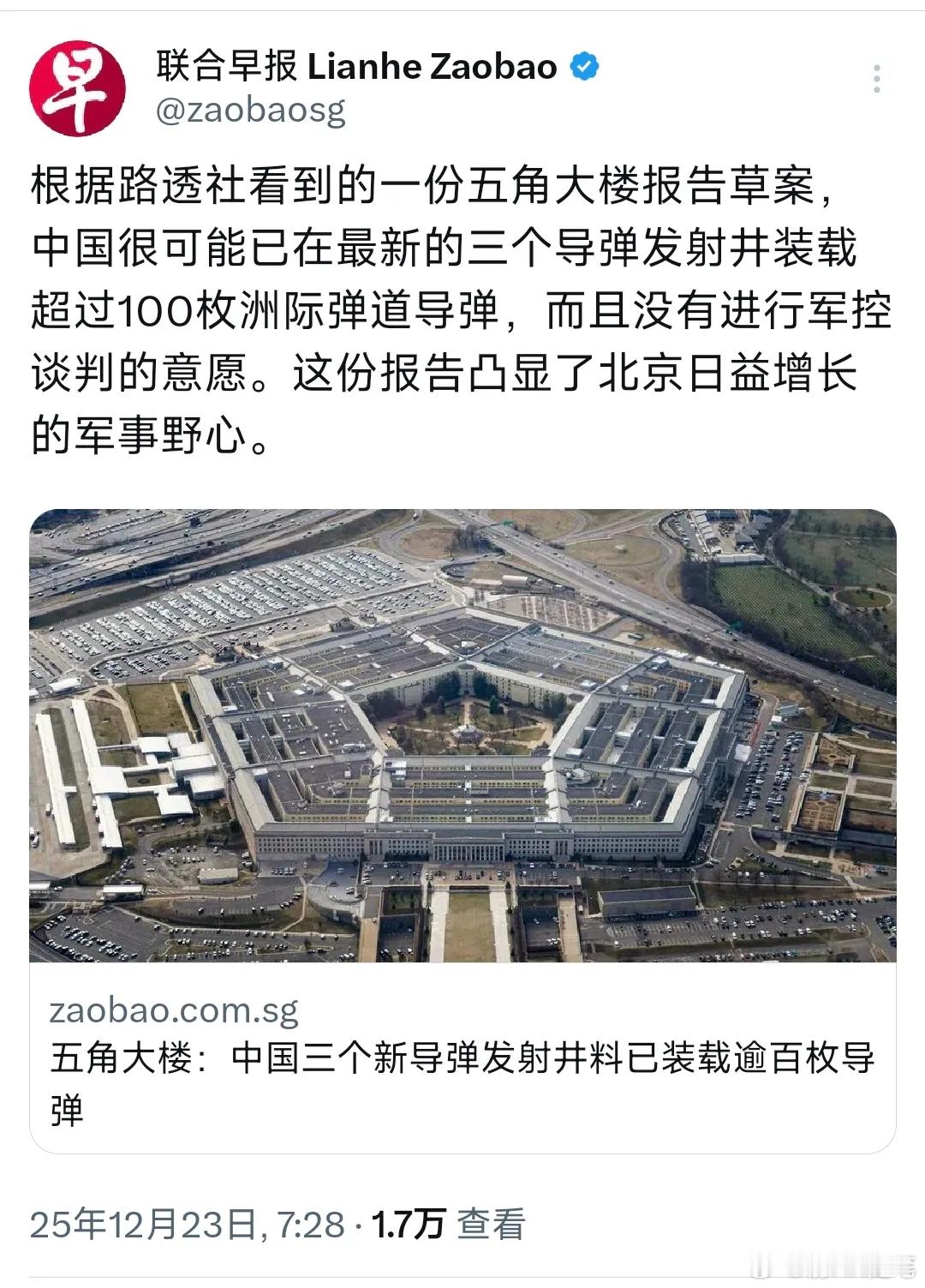 新加坡联合早报12月23日写道:“根据路透社看到的一份五角大楼报告草案,中国很可能已在最新的三个导弹发射井装载超过100枚洲际弹道导弹,而且没有进行军控谈判的意愿。这份报告凸显了北京日益增长的军事野心。”增加100枚还是少,美国每个州才两枚。增加1000枚吧,这样才能保证美国人友好了。