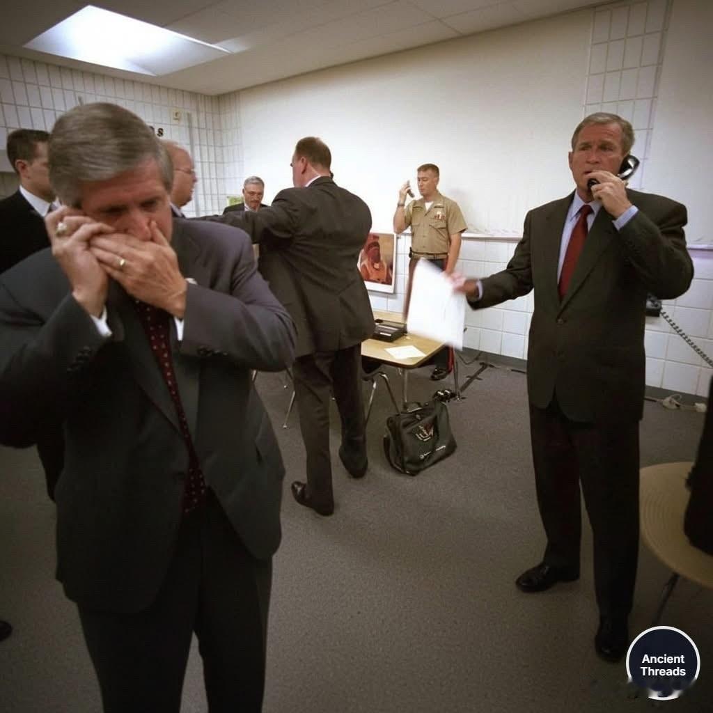 这张照片摄于2001年9月11日恐怖袭击发生后不久。 图片中打电话的人是时任美国总统乔治·W·布什(右)和白宫幕僚长安迪·卡德(左)。 照片拍摄于佛罗里达州萨拉索塔(Sarasota)的埃玛·E·布克小学(Emma E. Booker Elementary School)的一间教室改造的临时办公室里。 当天上午,布什总统正在该校参加一个阅读推广活动。在得知第二架飞机撞击世贸中心的消息后,他被迅速带到一个安全的房间,并通过电话与副总统迪克·切尼(Dick Cheney)、纽约州州长乔治·帕塔基(George Pataki)和联邦调查局局长罗伯特·穆勒(Robert Mueller)等高级官员联系,商讨应对措施。 这些照片由总统的私人摄影师埃里克·德雷珀(Eric Draper)拍摄,记录了美国政府在国家危机最初几个小时的紧急反应。