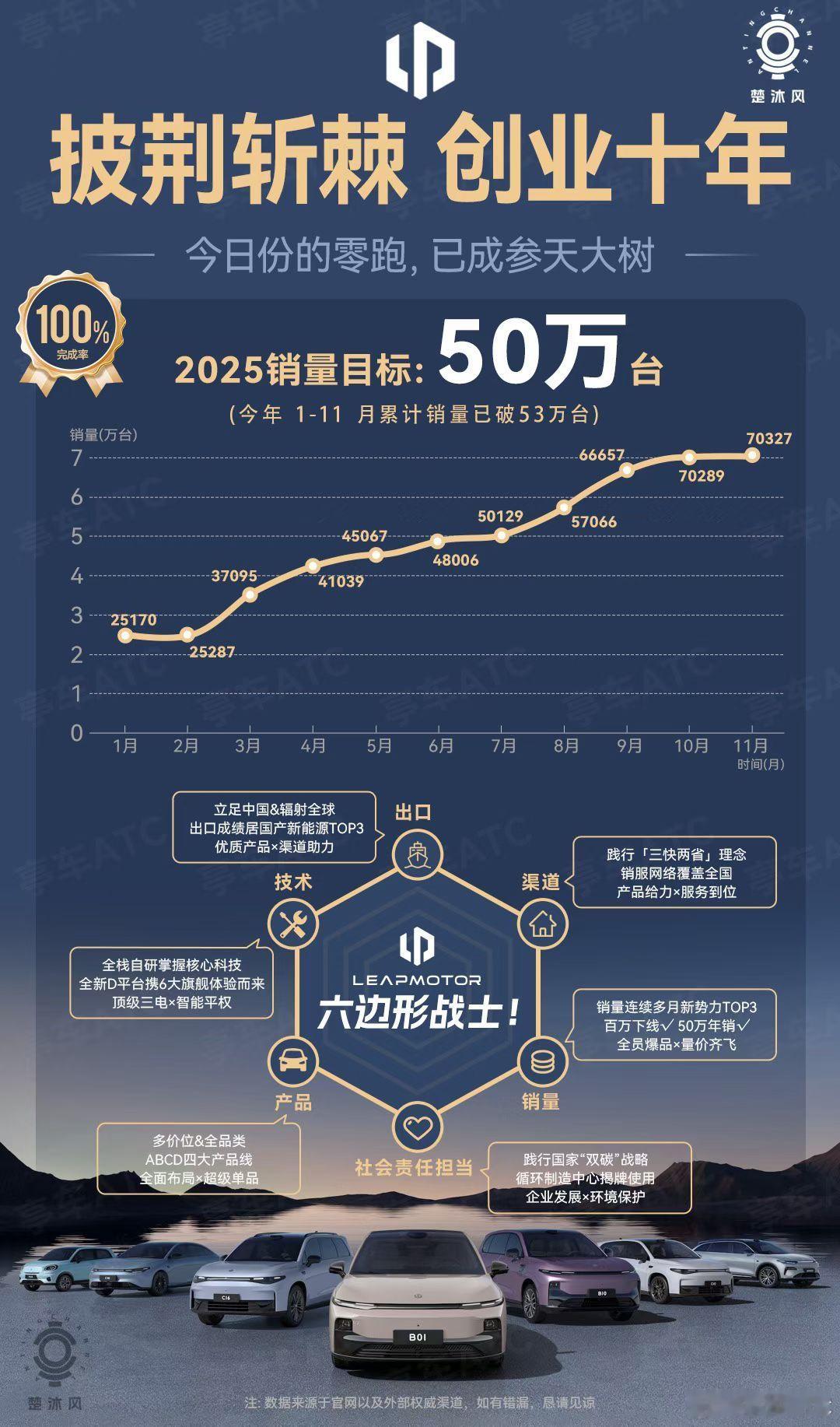 零跑创业十年交出的这份成绩单,足以让市场重新审视这个新能源赛道的“实干派”。2025年50万台的销量目标,在11月就已完成106%的达成率,累计销量突破53万台,从月度销量曲线能清晰看到,零跑从年初2.5万台左右的基数一路爬坡,11月销量冲到70327台,增长势头堪称迅猛,这种持续上扬的走势,既印证了产品力的持续释放,也说明市场对零跑的认可度在不断提升。能实现这样的销量突破,零跑的“全栈自研”是核心底气。从三电系统到智能平权,零跑把核心技术握在自己手里,全新D平台落地后,六大旗舰的体验升级也让产品竞争力再上台阶。而产品端的ABCD四大产品线布局,覆盖多价位与全品类,既拉宽了受众面,也打造出能打硬仗的超级单品,这让零跑在激烈的市场竞争中,有了“量价齐飞”的资本。更值得一提的是,零跑不只是盯着国内市场,出口成绩跻身国产新能源TOP3,实现了“立足中国、辐射全球”的布局;渠道端践行“三快两省”,让销售网络覆盖全国,服务落地更高效。同时,零跑还将企业发展与“双碳”战略结合,循环制造中心的投用体现了社会责任担当。十年时间,零跑从初创企业成长为销量稳居新势力TOP3的“六边形战士”,这份答卷,是实干的最好证明。大v聊车