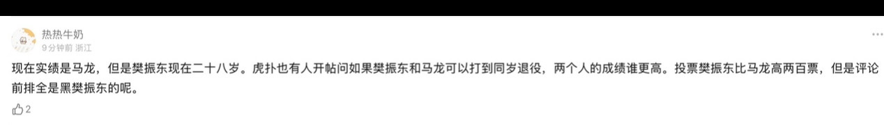 “现在实绩是马🐲,但是🍚振动现在二十八岁。虎扑也有人开帖问如果🍚振动和马🐲可以打到同岁退役,两个人的成绩谁更高。投票🍚振动比马🐲高两百票,但是评论前排全是🍚振动的呢。”虎扑男你们的话真的有人放在心上了
