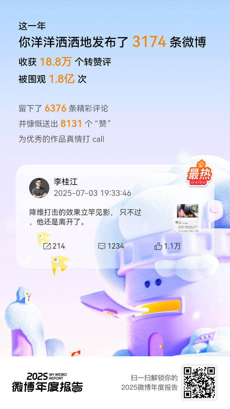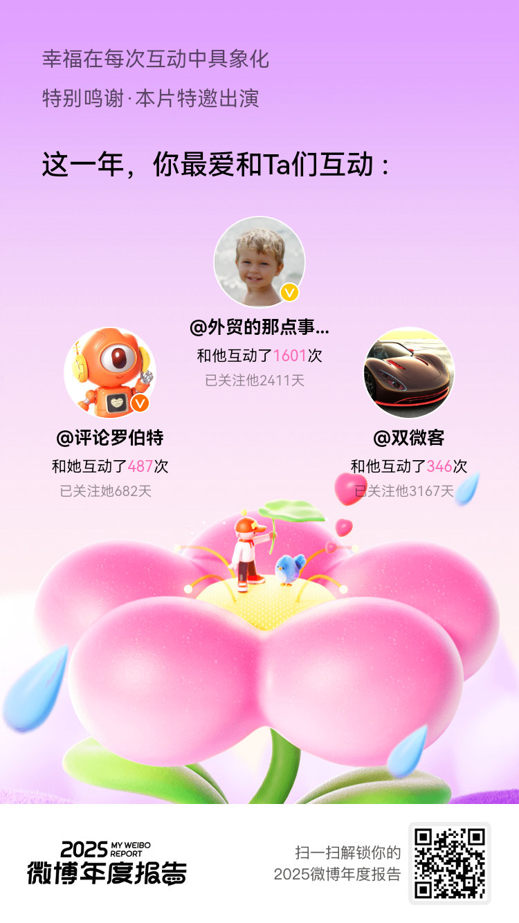 这位高雅人士,来微博15年了,还没发现比他早的,364天上微博,只有一天休息。科技榜上了11次,加上本月也就全勤了,微博可以考虑给他颁个奖不!给2025努力的点个赞!也把大大的赞送给你们!老铁们,2026年跟他继续铁铁。