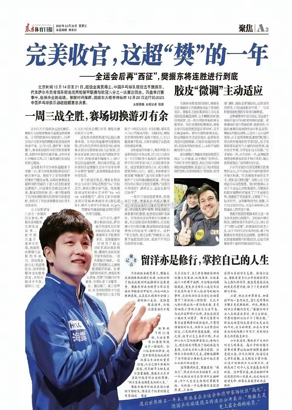 樊振东 东方体育日报:超“樊”的一年!超级金满贯得主、中国乒乓球队现役选手樊振东!12月24日,东方体育日报头版、第三版全版刊登有关樊振东的报道:《超“樊”的一年》、《完美收官,这超“樊”的一年》。“全运会后再‘西征”,樊振东将胜利进行到底”,“留洋亦是修行,掌握自己的人生”。就应该这样多报道正能量运动员!樊振东已成为一种精神,逆境中能扛住、能崛起、能翻盘的精神,激励无数人奋斗、前行!