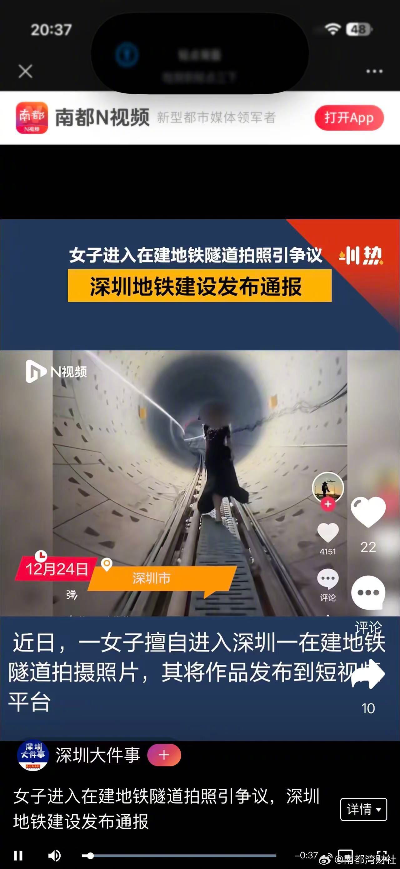 【#女子进入在建地铁隧道拍照引争议#,深圳地铁建设发布通报】近日,一女子擅自进入深圳一在建地铁隧道拍摄照片,其将作品发布到短视频平台并配文“当你找到合适走路的隧道”。相关视频在引发网友关注后。该女子发布的作品已清空。12月24日下午,深圳地铁建设集团有限公司发布情况通报。女子进入在建地铁隧道拍照引争议,深圳地铁建设发布通报