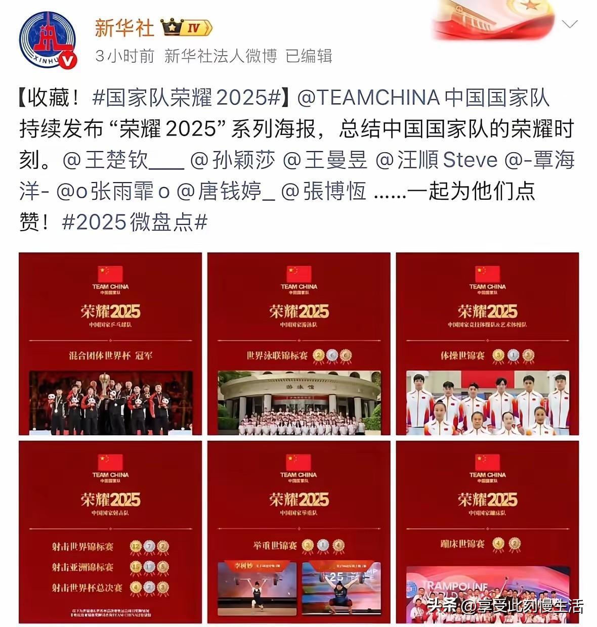 新华社发布国家队荣耀2025系列海报。把中国乒乓球队放在首位。肯定了王楚钦,孙颖莎,王曼昱。紧随其后的是游泳队,肯定了汪顺,覃海洋和张雨霏。体操队,举重队和射击队。辛苦征战一整年一直没有被忘记,被记得或许这就是运动员最大的心愿吧!