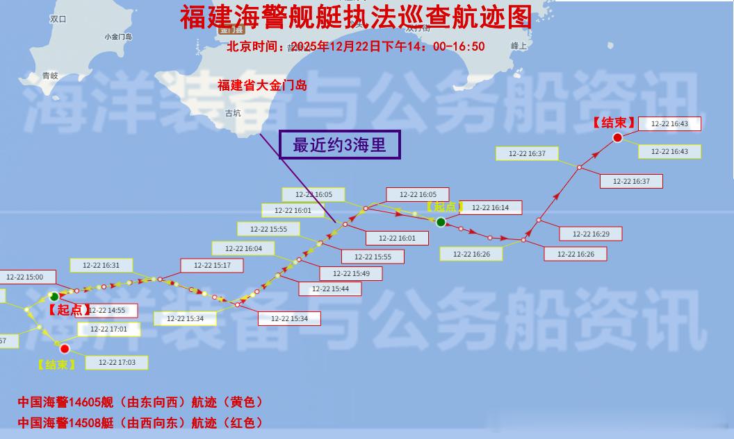 福建海警位金门附近海域开展常态执法巡查 【海警】2025年12月22日下午14:00-16:50,福建海警局组织中国海警14605舰、中国海警14606舰、中国海警14609舰和中国海警14508艇组成的执法巡查编队,位我福建省金门岛南侧海域开展常态化执法巡查(今年第44次)。中国海警在行动中国海警执法 【详情】网页链接