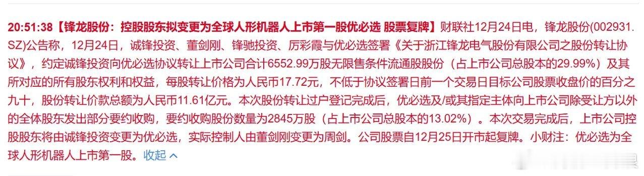 机器人的声音开始多起来1.杭州六小龙”云深处启动IPO2.优必选拟以16.65亿收购锋龙股份 或将返回A股,明天复牌珠城科技:独家供应机器人高可靠连接器,Walker S2已小批量交付。已有异动,最相关。三花智控:关节总成主力供应商,板块核心。天奇股份:前期辨识度,与优必选合资成立“无锡优奇”,缺点下行趋势。